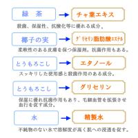 緑茶由来チャ葉エキス、椰子の実由来グリセリン脂肪酸エステル、トウモロコシ由来エタノール、グリセリン、精製水