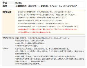 ■成分 石油系溶剤(約38%)、研磨剤、シリコーン、カルナバロウ