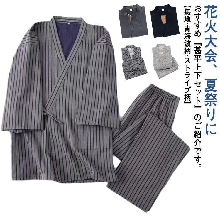 甚平 浴衣 メンズ 綿 麻 パジャマ 上下セット 七分袖 長ズボン 春 夏 前開き 無地 青海波柄 ストライプ柄 おしゃれ 作務衣 和服 じんべい 花