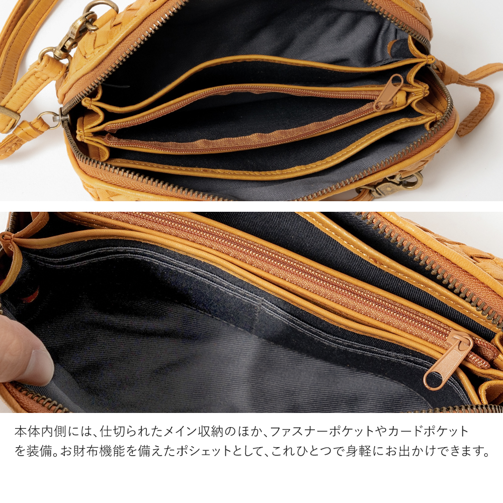 約250gと非常に軽量で、旅行のサブバッグや貴重品入れとしても最適です。