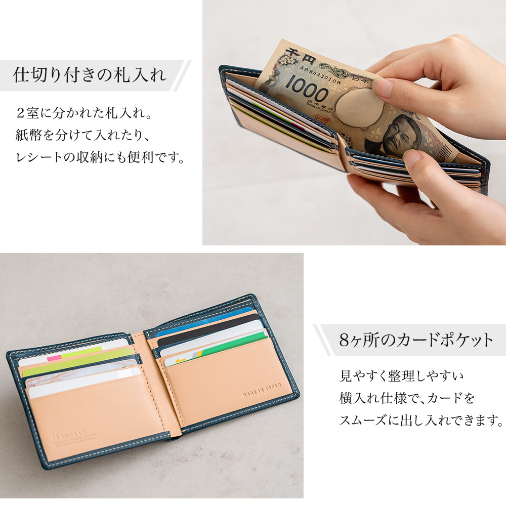 スリムな小銭入れなしタイプの二つ折り財布で、カード入れは8枚分つき。お札入れは二室に分かれているのでレシートやチケットなどの収納に便利。