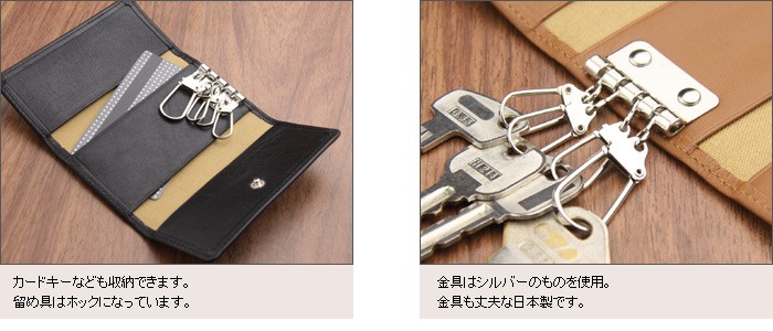 4つの金具のうち、ひとつが大きな鍵にも対応した大きな金具がついています。カードキーなども収納可能。
