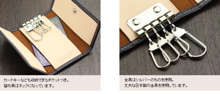 鍵をつける金具は4つついています。カードキーなどを収納できるカードポケットつき。