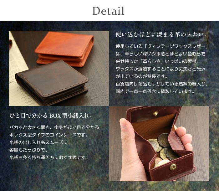 日本製の高品質な牛革のBOX型の小銭入れ、コインケースです。