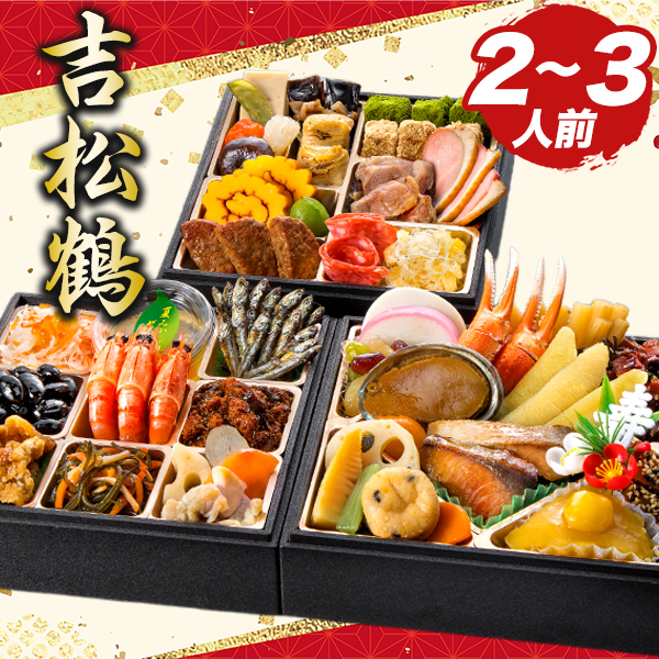 | 【吉松鶴】40品目 約2〜3人前 セット品:祝箸3膳、風呂敷、お品書き <壱の重>(計14品) 蒲鉾(紅)、蒲鉾(白)、三色豆、田舎煮、たたき牛蒡、鮪昆布、ごまポテト、芋金団、栗甘露煮、かに爪、味付数の子、蝦夷鮑旨煮、鰤照り焼、金柑甘露煮 <弐の重>(計10品) 紅白なます、いくら醤油漬け、夏みかんゼリー、田作り、黒豆、有頭海老艶煮、真鱈子昆布、おつまみ鶏皮、松前漬け、筑前煮 <参の重>(計16品) 高野豆腐、花こんにゃく(白)、花こんにゃく(紅)、椎茸旨煮、さやえんどう、一口にしん昆布巻、焼湯葉巻、伊達巻、若桃甘露煮、ハンバーグ、わらび餅(抹茶)、わらび餅(きな粉)紅茶合鴨スモーク、紅茶合鴨炭火焼、ソフトサラミスライス、数の子サラダ |