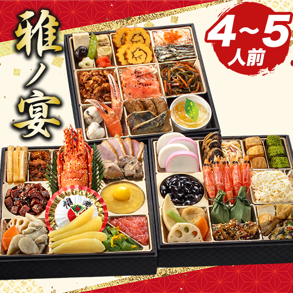 | 【雅ノ宴】45品目 約4〜5人前 セット品:祝箸5膳、風呂敷、お品書き <壱の重>(計12品) たたき牛蒡、真鱈子昆布、鮪昆布、筑前煮、ロブスター、味付数の子、紅茶合鴨スモーク、紅茶合鴨炭火焼、芋金団、栗甘露煮、帆立明太、菊花くらくら和え <弐の重>(計14品) 蒲鉾(紅)、蒲鉾(白)、鮭昆布巻、海鮮マリネ、わらび餅(抹茶)、わらび餅(きな粉)、黒豆、有頭海老艶煮、数の子サラダ、田舎煮、笹巻団子、ごまポテト、鶏照焼、胡瓜くらげ <参の重>(計19品) 高野豆腐、椎茸旨煮、焼湯葉巻、花こんにゃく(紅)、花こんにゃく(白)、さやえんどう、伊達巻、紅白なます、いくら醤油漬け、田作り、かつおくるみ、サーモンスライス、松前漬け、椎茸しんじょ、海老しんじょ、かに爪、ハンバーグ、鰆西京焼、夏みかんゼリー |