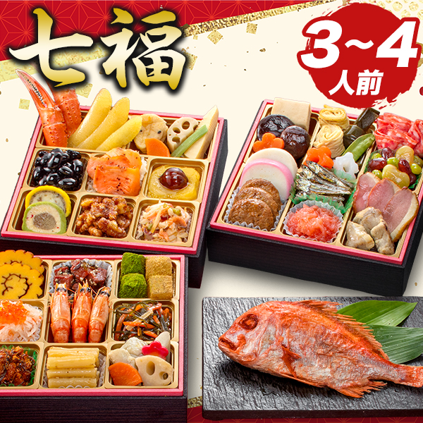 | 【七福】41品目 約3人前 セット品:祝箸3膳、風呂敷、お品書き <壱の重>(計11品) かに爪、味付数の子、田舎煮、黒豆、スモークサーモンスライス、芋金団、渋皮栗甘露煮、合鴨テリーヌ、はかたテリーヌ、かつおくるみ、海鮮マリネ <弐の重>(計12品) 伊達巻、鮪昆布、わらび餅(抹茶)、わらび餅(きな粉)、紅白なます、いくら醤油漬け、有頭海老艶煮、松前漬け、真鱈子昆布、たたき牛蒡、筑前煮、梅麩 <参の重>(計17品) 高野豆腐、椎茸旨煮、梅花人参、焼湯葉巻、花こんにゃく(紅)、花こんにゃく(白)、結び昆布、さやえんどう、ソフトサラミ、三色豆、蒲鉾(紅)、蒲鉾(白)、ハンバーグ、田作り、帆立明太、紅茶合鴨スモーク、紅茶合鴨炭火焼 <別添>(計1品) 焼鯛 |