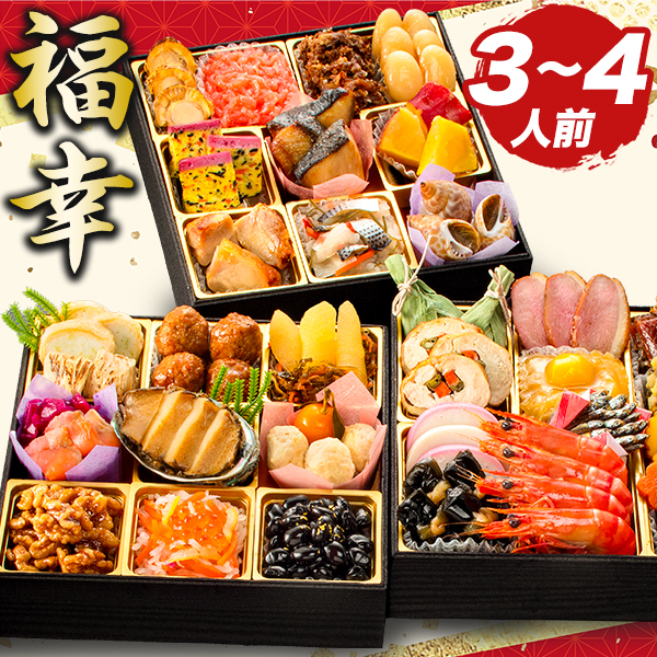 | 【福幸】39品目 約3〜4人前 セット品:祝箸5膳、風呂敷、お品書き <壱の重>(計15品) 笹くず餅(抹茶)、若鶏二色巻、合鴨スモーク、鳴門芋金団、栗甘露煮、棒たら甘露煮、たたき牛蒡西京漬け、蒲鉾(紅)、蒲鉾(白)、一口昆布巻、田作り、有頭海老艶煮、伊達巻、梅人参旨煮、椎茸旨煮 <弐の重>(計14品) 枝豆信田巻、焼湯葉巻、黒酢肉団子、味付数の子、松前漬け、スモークサーモン、紫キャベツのピクルス、蝦夷鮑のだし煮、鶏つくね柚子、金柑甘露煮、くるみ甘露煮、紅白なます、いくら醤油漬け、黒豆 <参の重>(計10品) 帆立旨煮、帆立明太、牛しぐれ煮、白花豆、玉子のしんじょ、鰤照焼、さつまいも甘露煮、彩りもも西京焼、こはだかぶら、味付バイ貝 |
