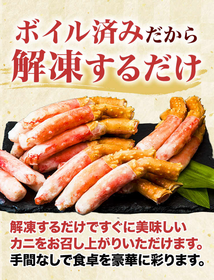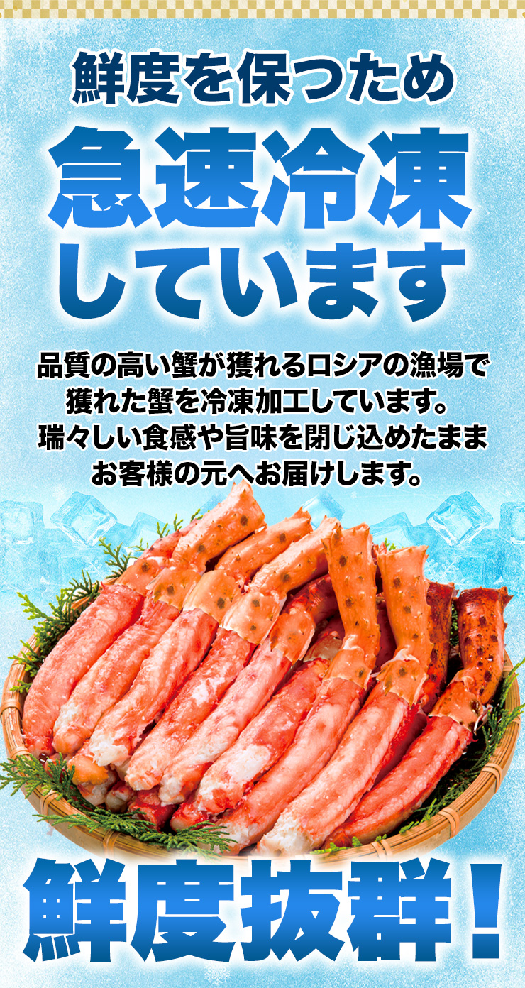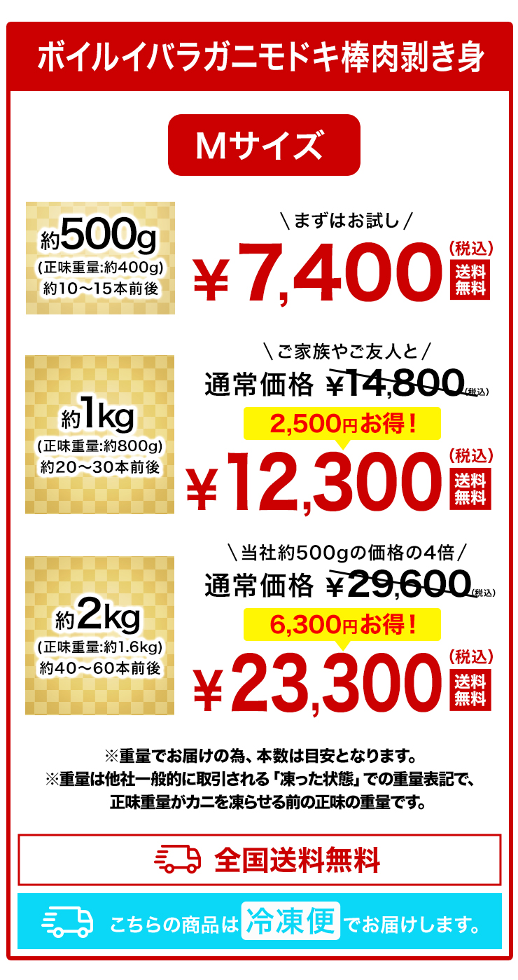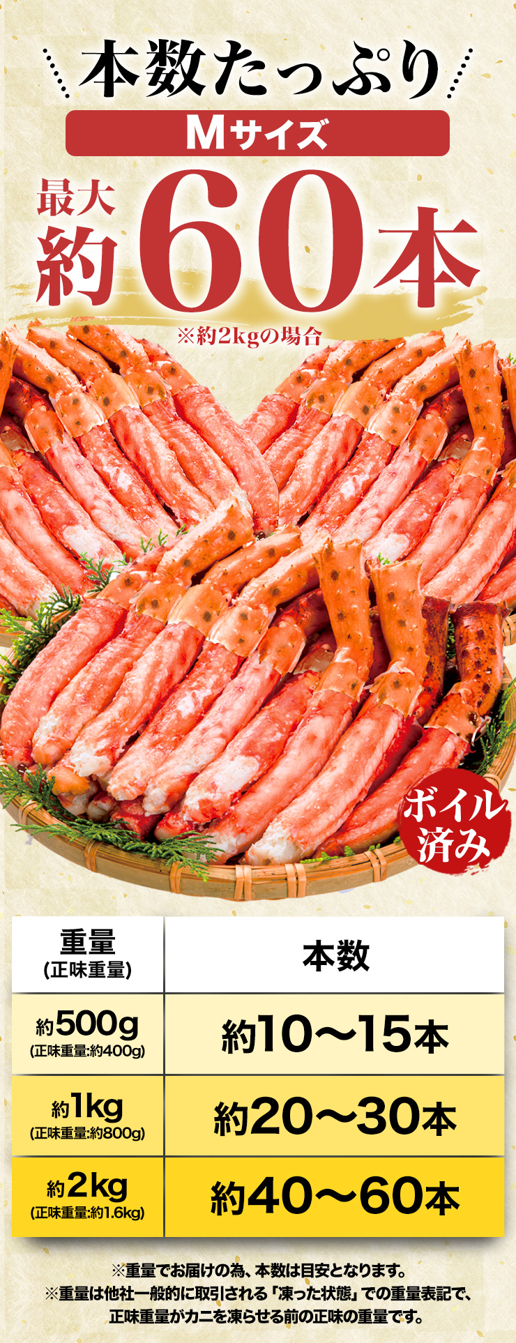 | 【Mサイズ】 ■約10〜15本前後 500g (正味重量:400g) ■約20〜30本前後 1kg (正味重量:800g) ■約40〜60本前後 2kg (正味重量:1.6kg) ※重量でのお届けとなる為、本数は前後します。 ※折れ、欠けを含む場合もございます。 ・空気に触れることによる乾燥や酸化を防ぐため氷の被膜をつけてお届けいたします。 ・( )内の正味重量(正味)とは、氷の被膜をつける前のカニ正味の重量です。 ・商品のラベルにはカニ正味の重量を記載しています。 |