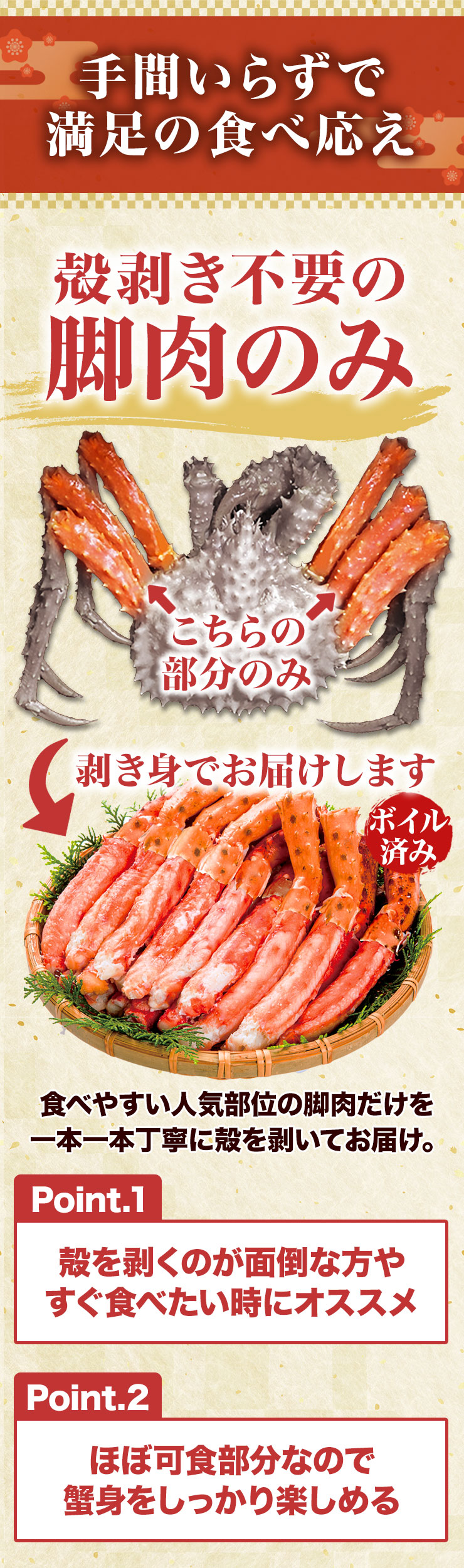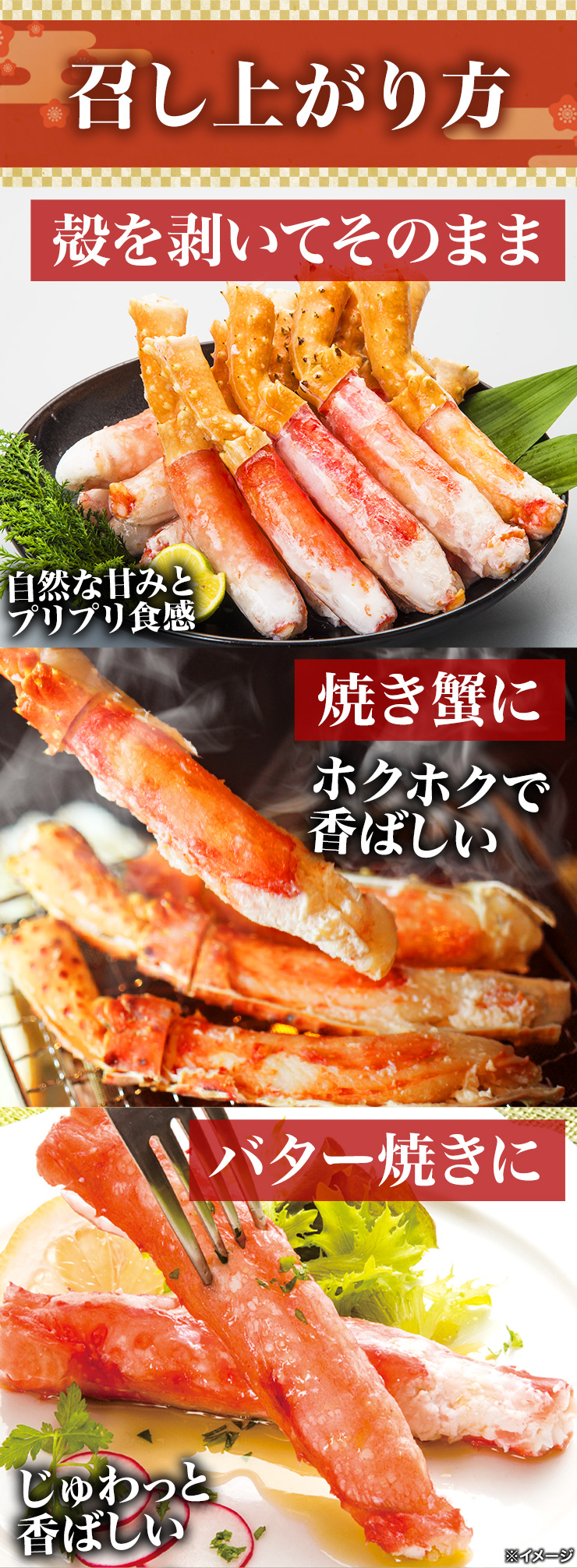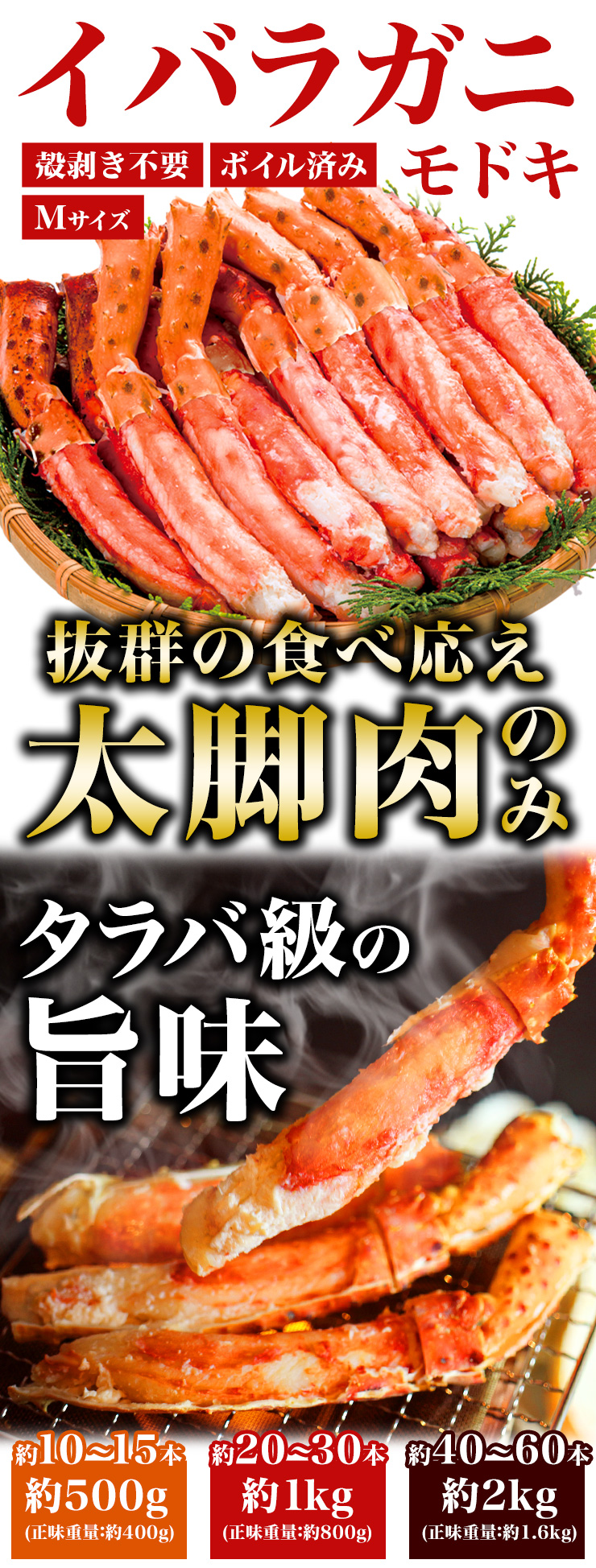 | 【Mサイズ】 ■約10〜15本前後 500g (正味重量:400g) ■約20〜30本前後 1kg (正味重量:800g) ■約40〜60本前後 2kg (正味重量:1.6kg) ※重量でのお届けとなる為、本数は前後します。 ※折れ、欠けを含む場合もございます。 ・空気に触れることによる乾燥や酸化を防ぐため氷の被膜をつけてお届けいたします。 ・( )内の正味重量(正味)とは、氷の被膜をつける前のカニ正味の重量です。 ・商品のラベルにはカニ正味の重量を記載しています。 |