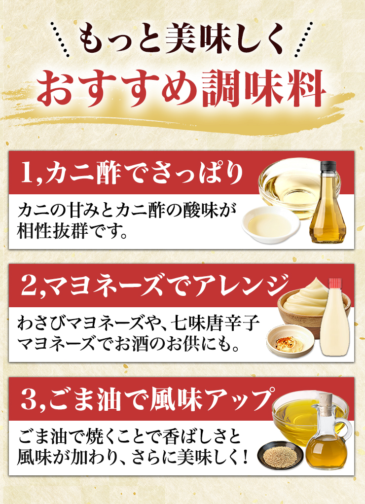 | ・食品につき、配送上の破損以外の返品はご容赦ください。 ・商品には万全を期しておりますが、配送途中で脚先が折れる場合もございます。 ・殻の表面に傷等がある場合がございますが、衛生上問題ございません。 ・開封後は冷蔵庫に保管の上、お早めにお召し上がりください。 ・のし紙、または包装紙のサービスは行っておりません。 |