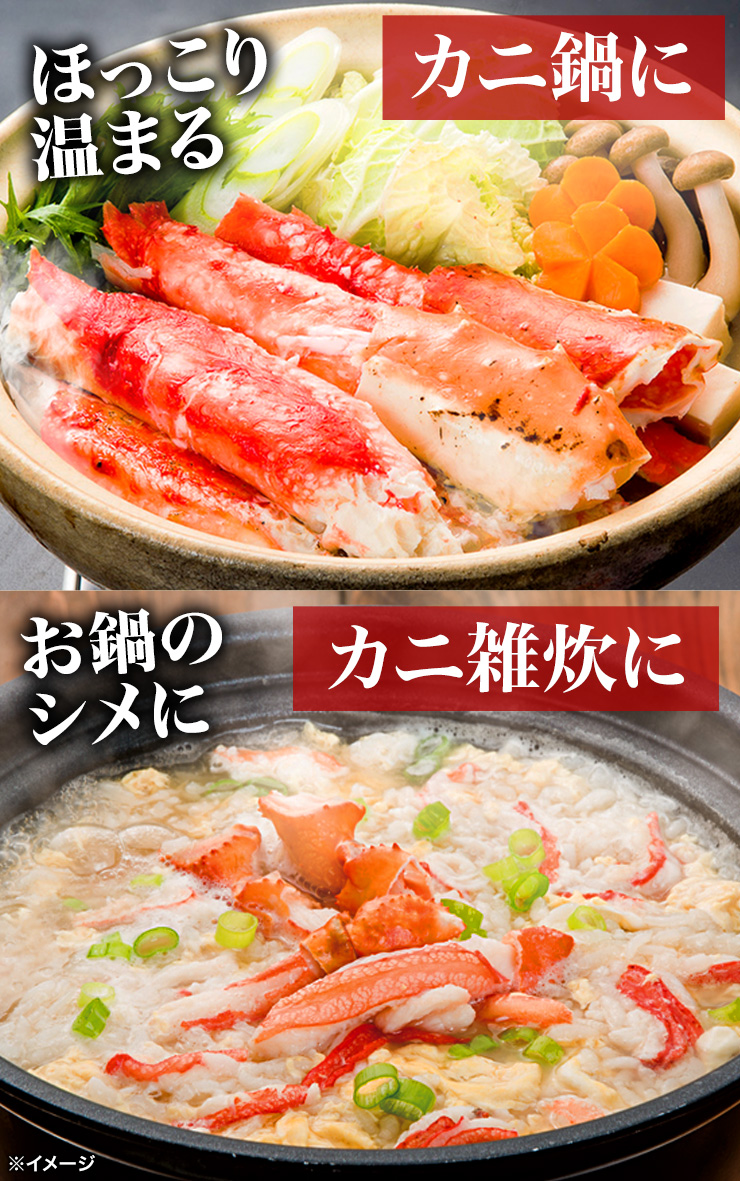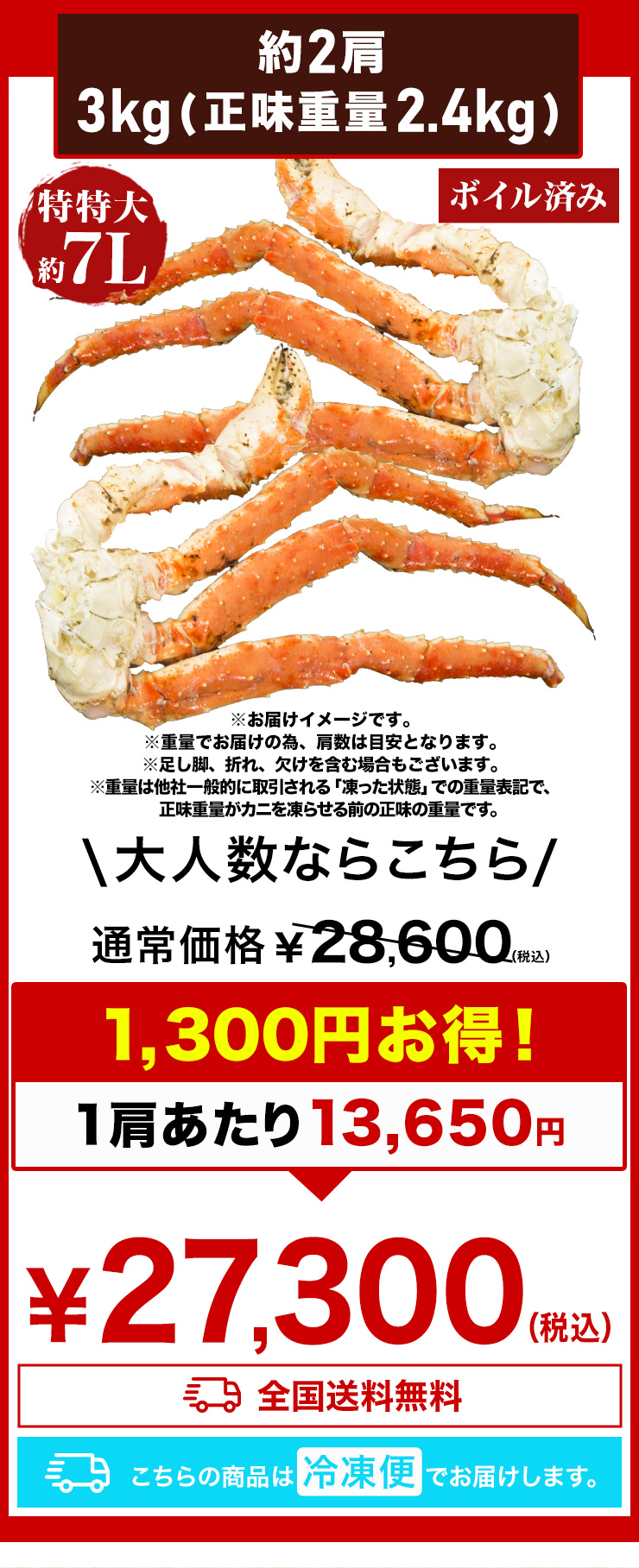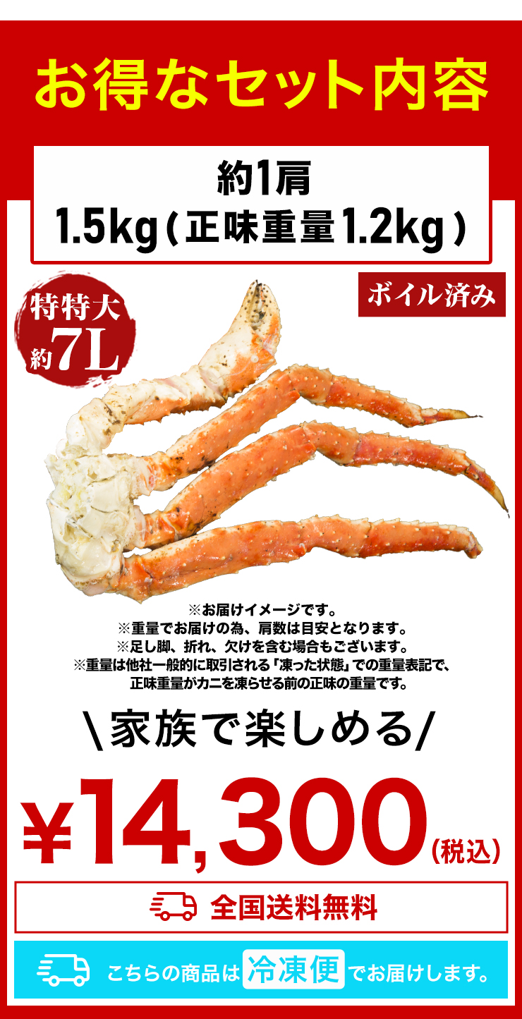 | 【約7L 特特大サイズ】 ■約1肩 1.5kg (正味重量1.2kg) ■約2肩 3kg (正味重量2.4kg) ※足し脚、折れ、欠けを含む場合もございます。 ※肩数は重量合わせの為、前後します。 ・空気に触れることによる乾燥や酸化を防ぐため氷の被膜をつけてお届けいたします。 ・( )内の正味重量(正味)とは、氷の被膜をつける前のカニ正味の重量です。 ・商品のラベルにはカニ正味の重量を記載しています。 |