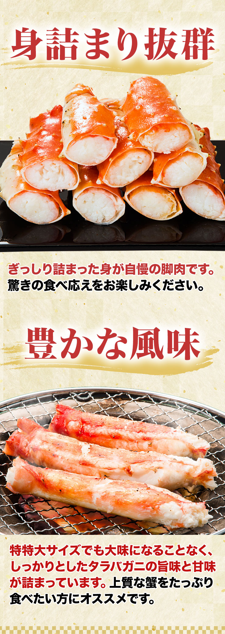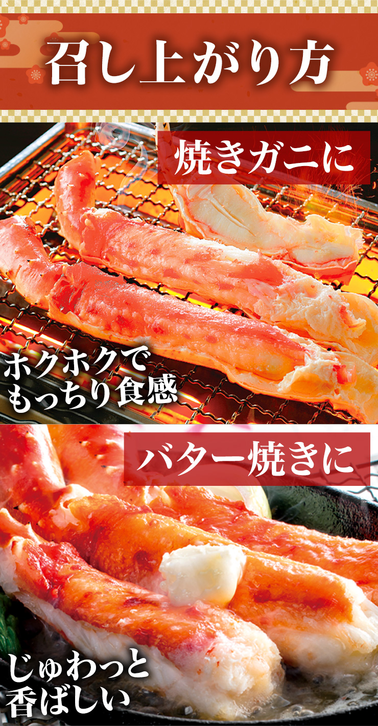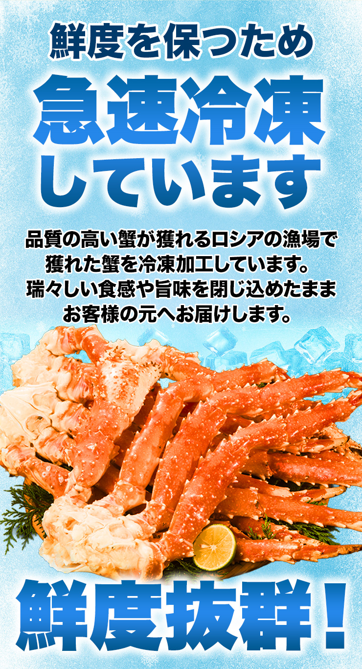 | 【約7L 特特大サイズ】 ■約1肩 1.5kg (正味重量1.2kg) ■約2肩 3kg (正味重量2.4kg) ※足し脚、折れ、欠けを含む場合もございます。 ※肩数は重量合わせの為、前後します。 ・空気に触れることによる乾燥や酸化を防ぐため氷の被膜をつけてお届けいたします。 ・( )内の正味重量(正味)とは、氷の被膜をつける前のカニ正味の重量です。 ・商品のラベルにはカニ正味の重量を記載しています。 |