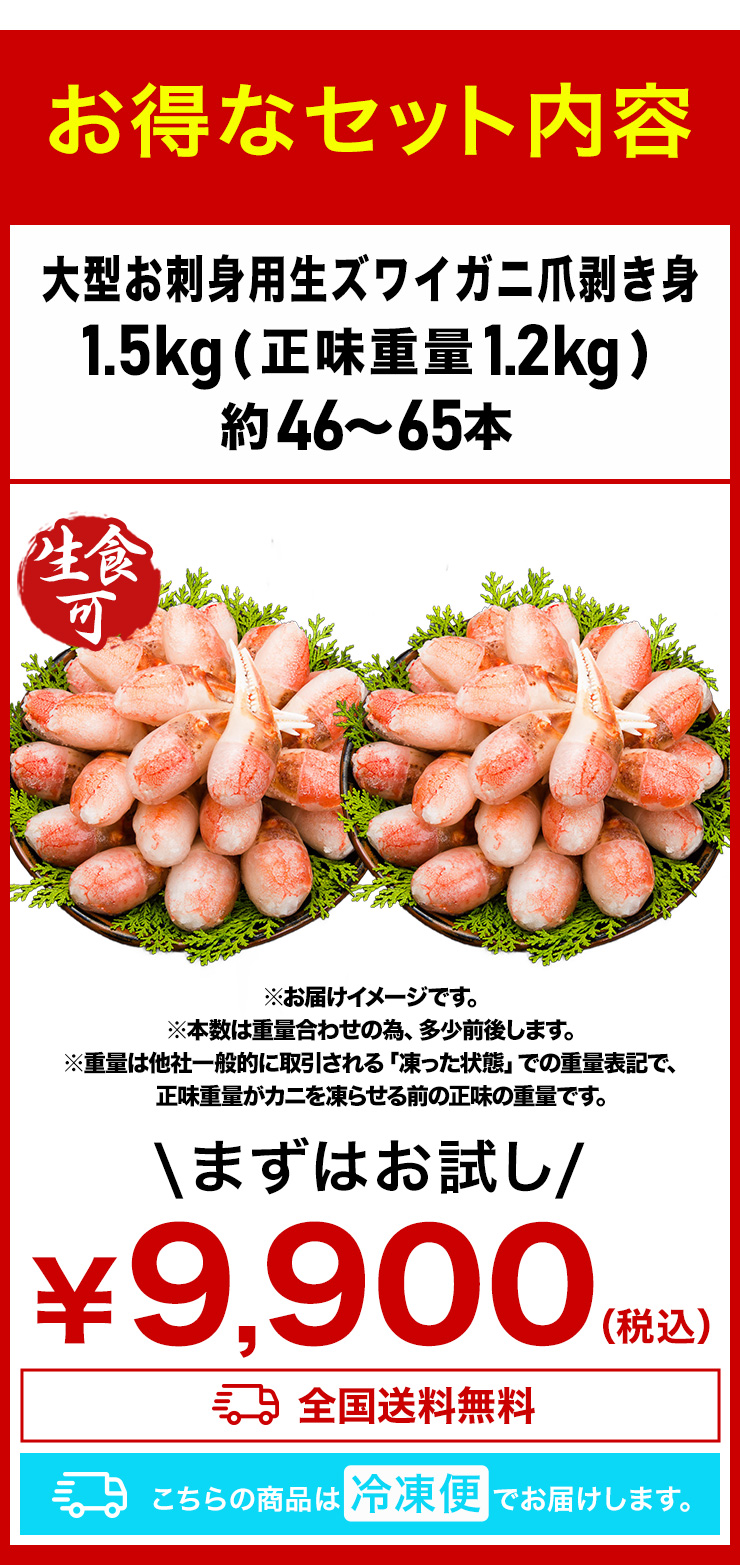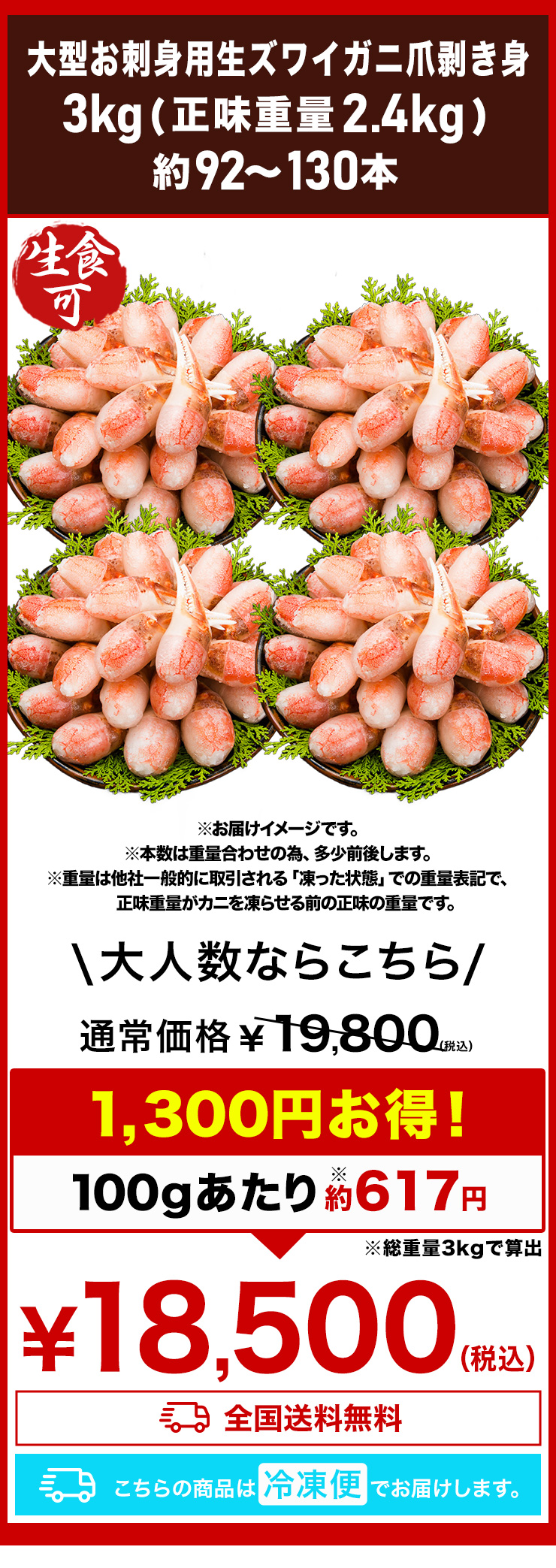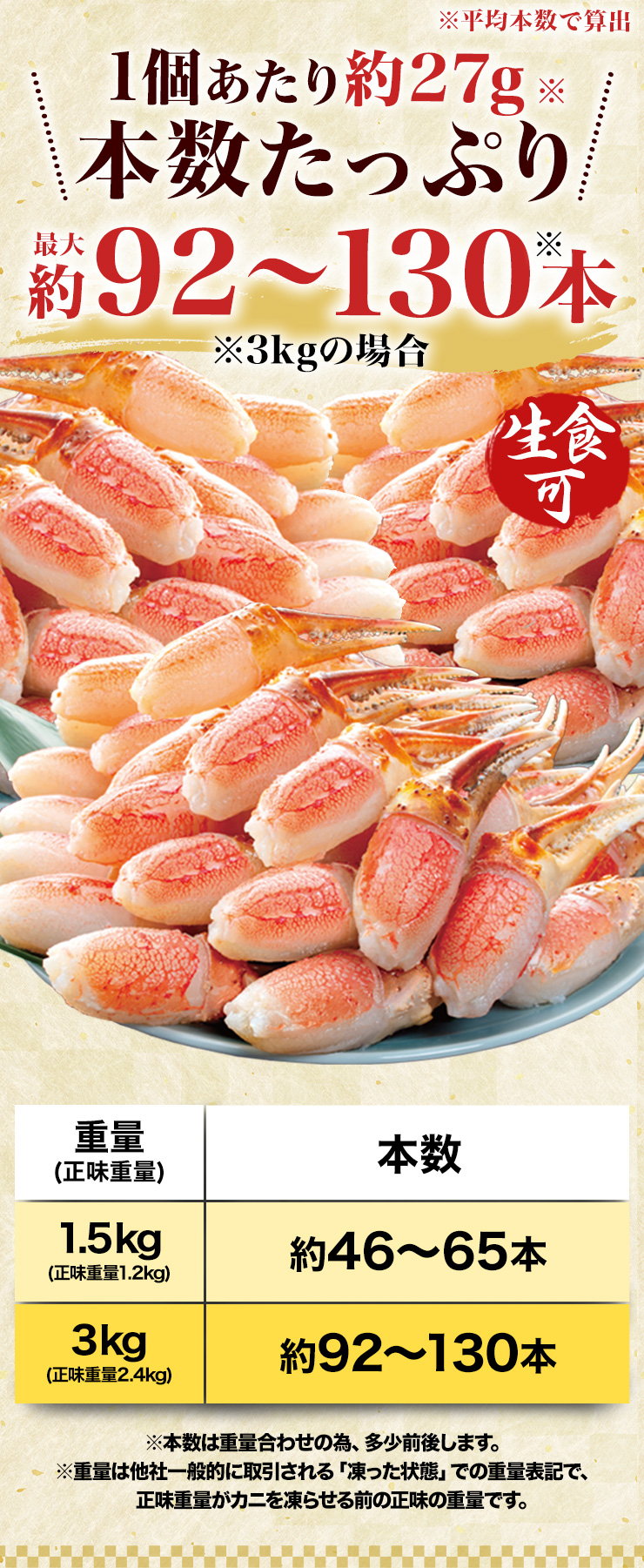| ■1.5kg(正味重量1.2kg) 【爪剥き身】約46〜65本前後 ■3kg(正味重量2.4kg) 【爪剥き身】約92〜130本前後 ※重量でお届けの為、本数は目安となります。 ・空気に触れることによる乾燥や酸化を防ぐため氷の被膜をつけてお届けいたします。 ・( )内の正味重量(正味)とは、氷の被膜をつける前のカニ正味の重量です。 ・商品のラベルにはカニ正味の重量を記載しています。 |