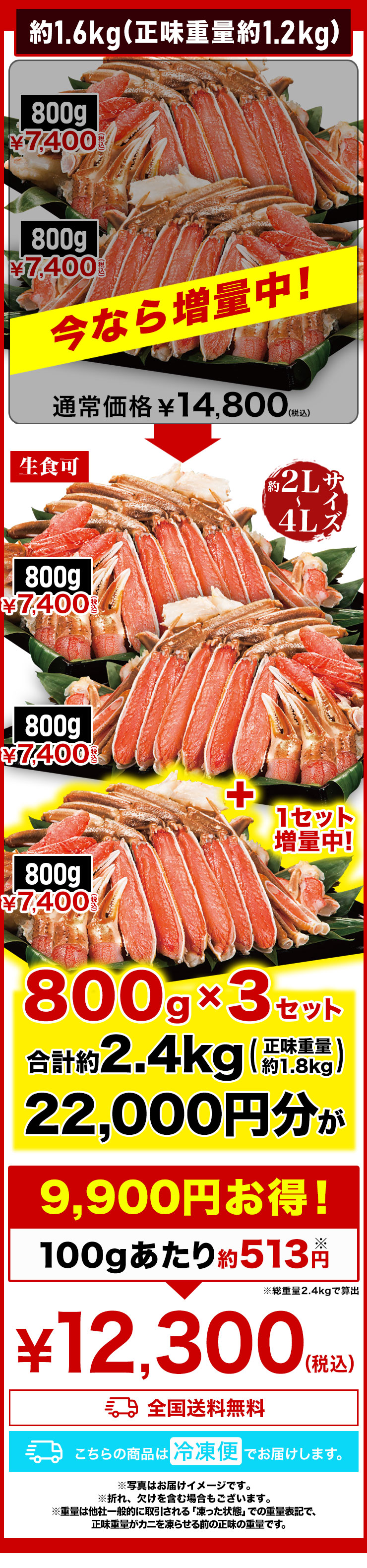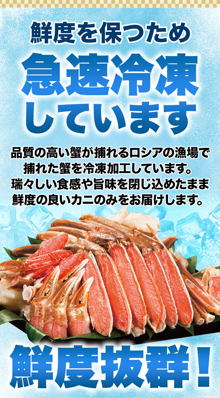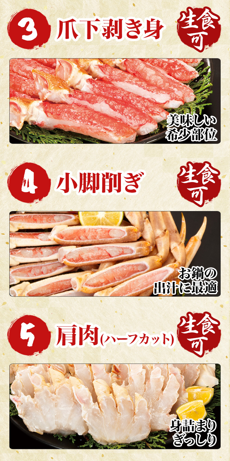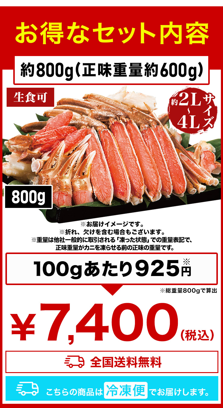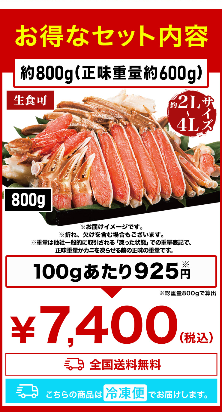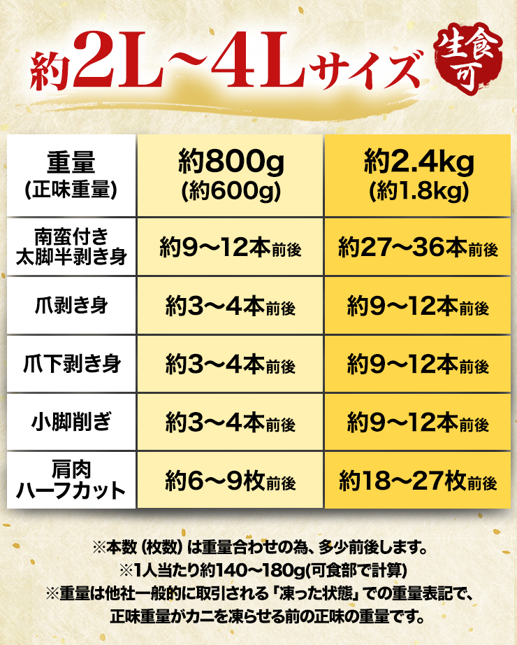 | 【約2L~4L 普通サイズ】 ■約800g(正味重量:約600g) 【南蛮付き太脚半剥き身(ハーフポーション)】約9〜12本前後 【爪剥き身(フルポーション)】約3〜4本前後 【爪下剥き身(ハーフポーション)】約3〜4本前後 【小脚削ぎ】約3〜4本前後 【肩肉(ハーフカット)】約6〜9枚前後 ■約2.4kg(正味重量:約1.8kg) 【南蛮付き太脚半剥き身(ハーフポーション)】約27〜36本前後 【爪剥き身(フルポーション)】約9〜12本前後 【爪下剥き身(ハーフポーション)】約9〜12本前後 【小脚削ぎ】約9〜12本前後 【肩肉(ハーフカット)】約18〜27枚前後 ※本数・枚数は重量合わせの為、多少前後します。 ・空気に触れることによる乾燥や酸化を防ぐため氷の被膜をつけてお届けいたします。 ・( )内の正味重量(正味)とは、氷の被膜をつける前のカニ正味の重量です。 ・商品のラベルにはカニ正味の重量を記載しています。 |