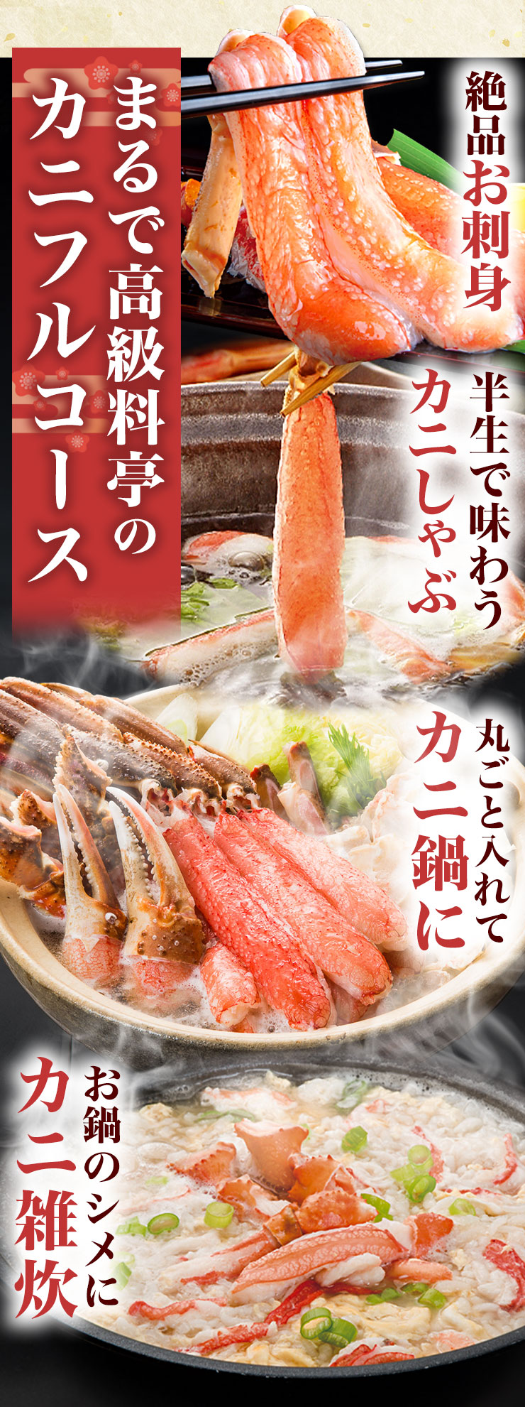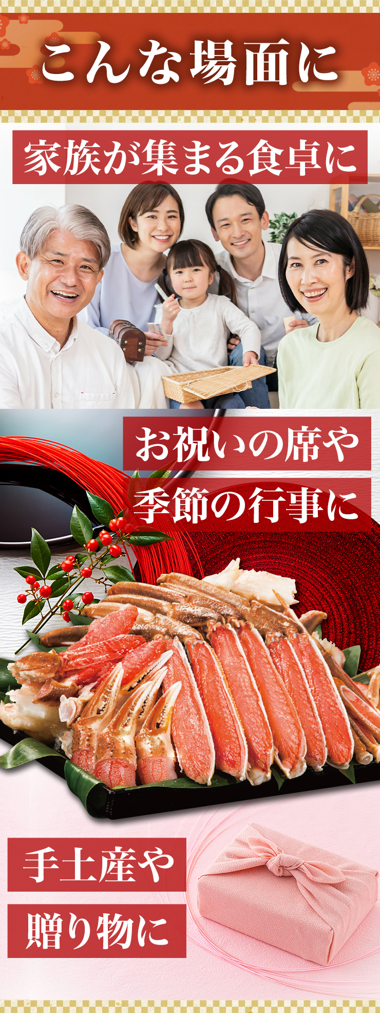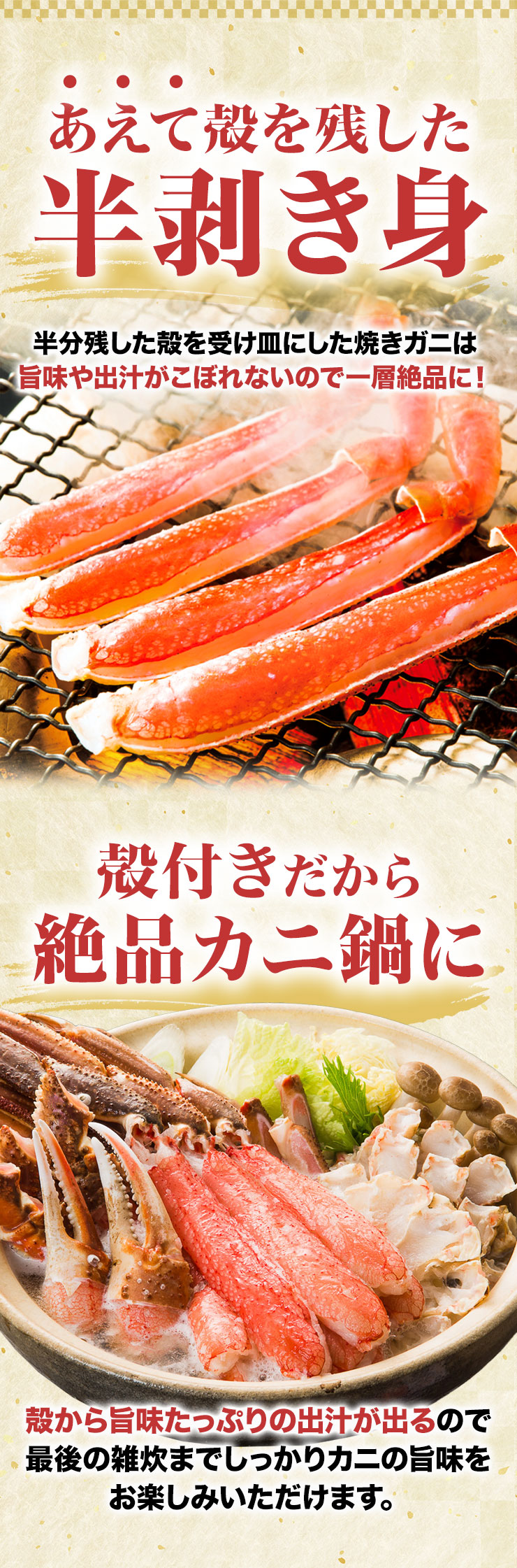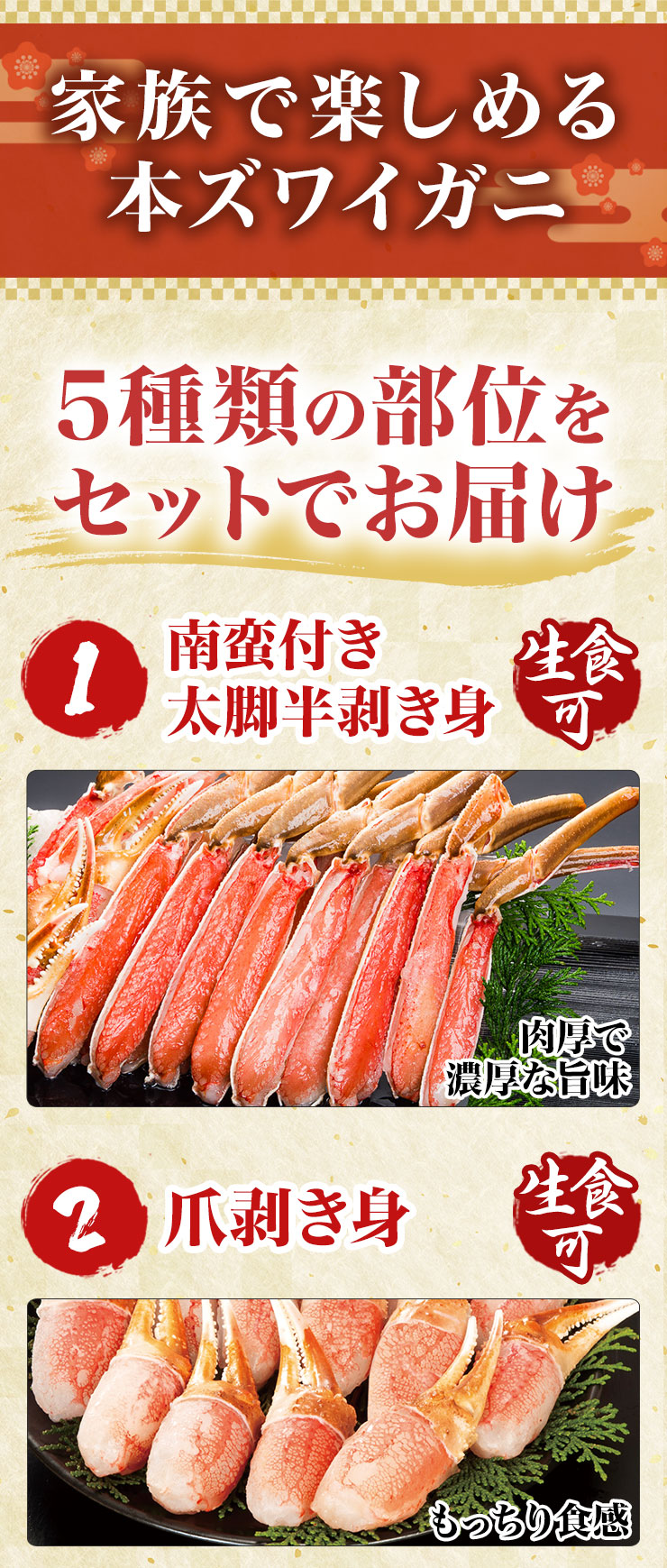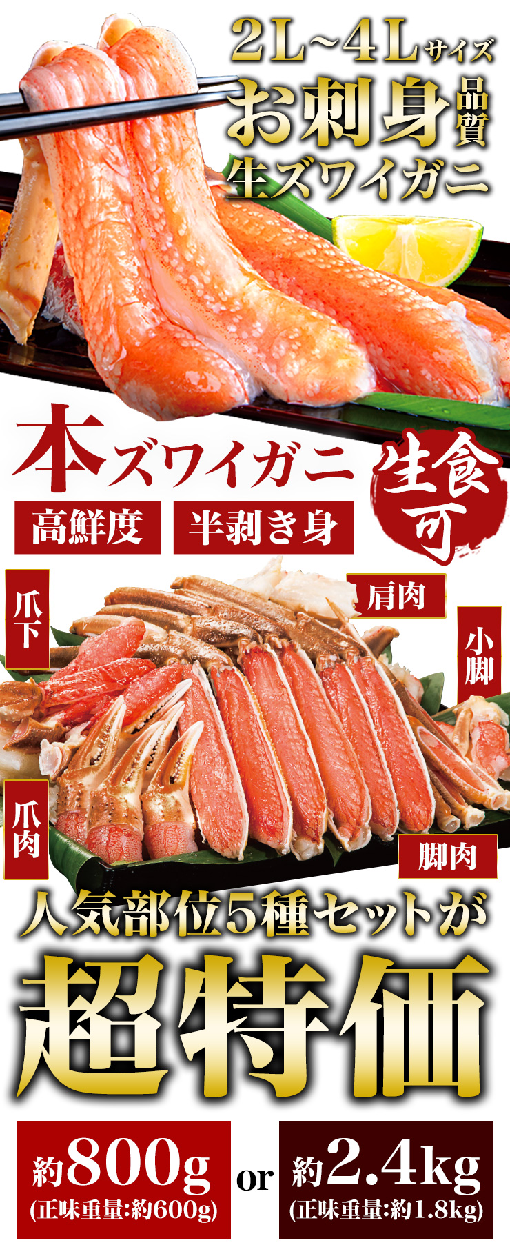 | 【約2L~4L 普通サイズ】 ■約800g(正味重量:約600g) 【南蛮付き太脚半剥き身(ハーフポーション)】約9〜12本前後 【爪剥き身(フルポーション)】約3〜4本前後 【爪下剥き身(ハーフポーション)】約3〜4本前後 【小脚削ぎ】約3〜4本前後 【肩肉(ハーフカット)】約6〜9枚前後 ■約2.4kg(正味重量:約1.8kg) 【南蛮付き太脚半剥き身(ハーフポーション)】約27〜36本前後 【爪剥き身(フルポーション)】約9〜12本前後 【爪下剥き身(ハーフポーション)】約9〜12本前後 【小脚削ぎ】約9〜12本前後 【肩肉(ハーフカット)】約18〜27枚前後 ※本数・枚数は重量合わせの為、多少前後します。 ・空気に触れることによる乾燥や酸化を防ぐため氷の被膜をつけてお届けいたします。 ・( )内の正味重量(正味)とは、氷の被膜をつける前のカニ正味の重量です。 ・商品のラベルにはカニ正味の重量を記載しています。 |