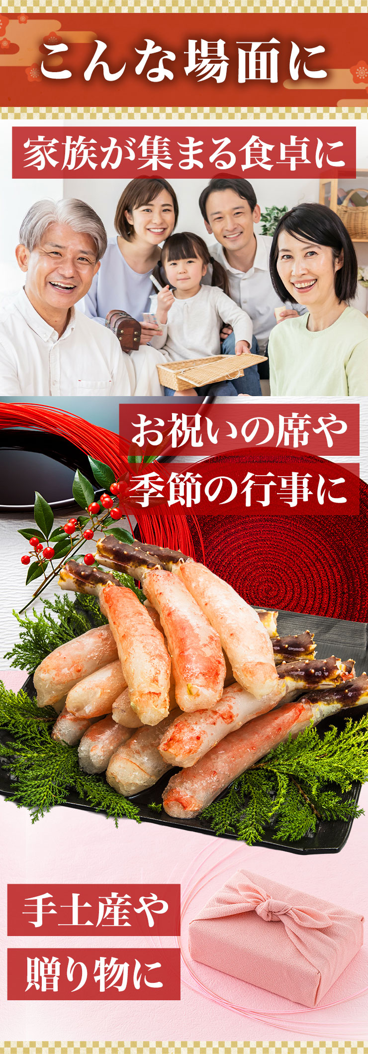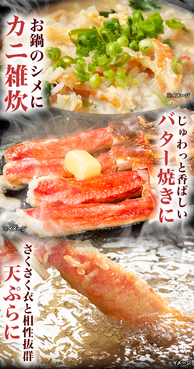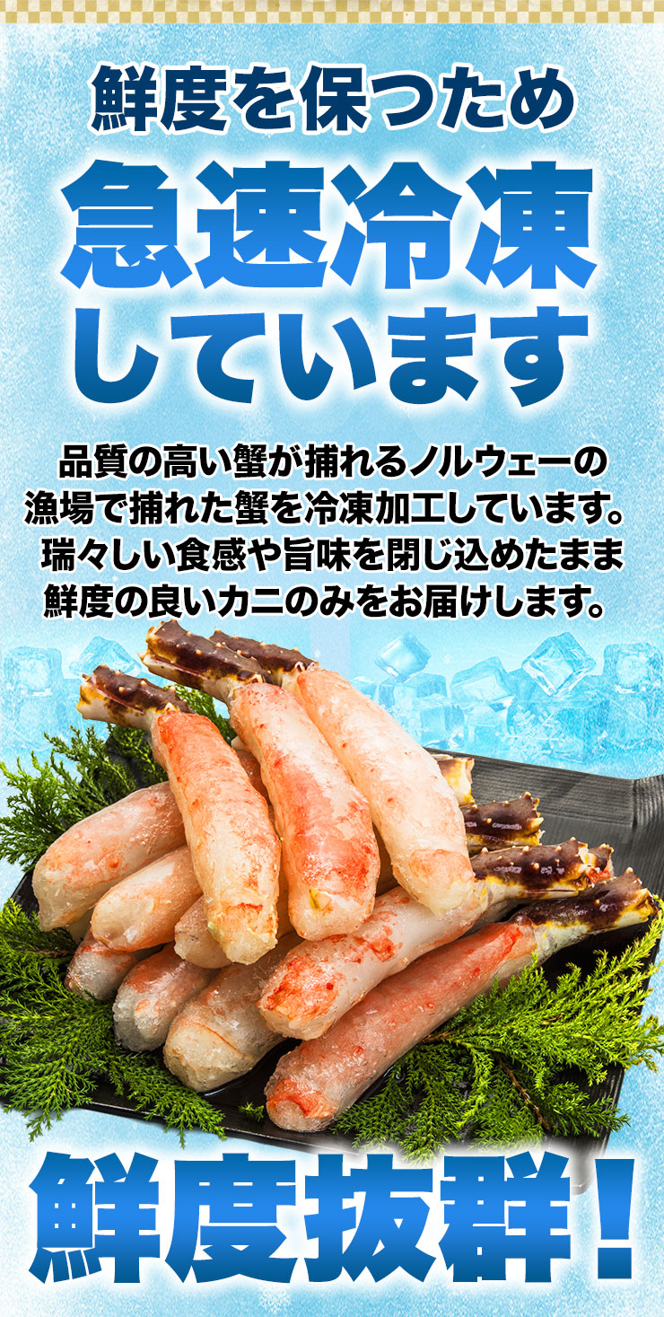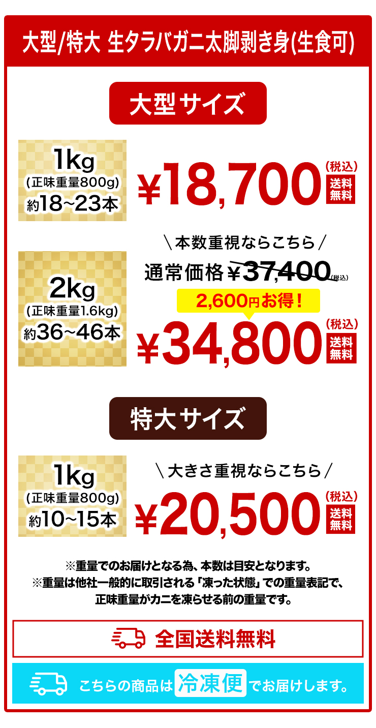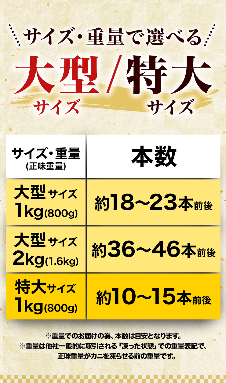 | ■大型 1kg (正味重量800g) 約18〜23本前後 ■大型 2kg (正味重量1.6kg) 約36~46本前後 ■特大 1kg (正味重量800g) 約10〜15本前後 ※重量でお届けの為、本数目安となります。 ・空気に触れることによる乾燥や酸化を防ぐため氷の被膜をつけてお届けいたします。 ・( )内の正味重量(正味)とは、氷の被膜をつける前のカニ正味の重量です。 ・商品のラベルにはカニ正味の重量を記載しています。 |