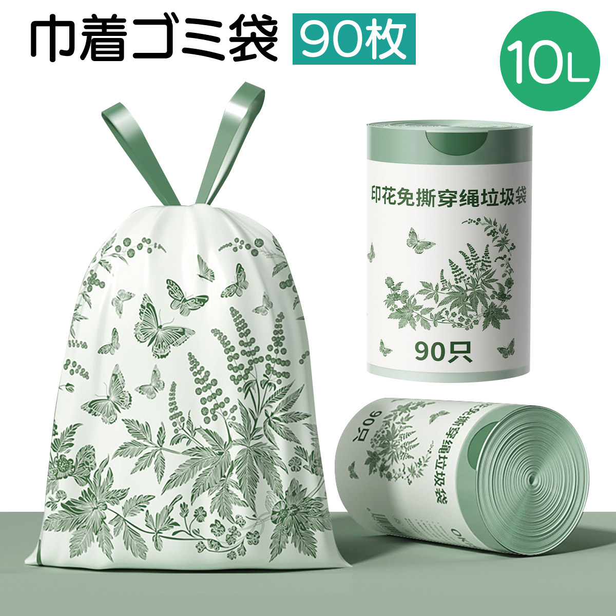 ゴミ袋 巾着 10L 90枚 ごみ袋 ヨモギの香り 1枚ずつロール状 破れにくい 香り付き ひも付き ひもで縛る密封設計 おむつ gomibukuro