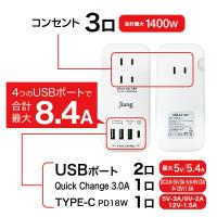 ACアダプター USB 12V 5a type c PD対応 急速充電 充電器 コンセント 電源タップ 8.4A 1400W ノートパソコン Quick Charger 3.0A対応 jiang-tap04
