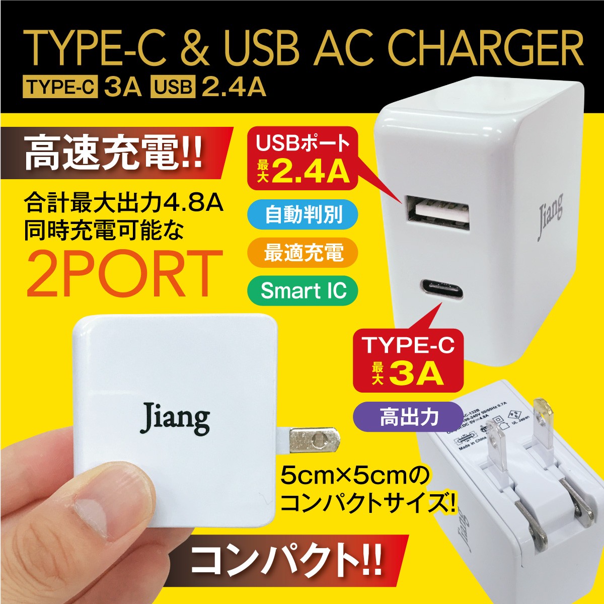 タイプC TypeC ACアダプター ケーブル USB コンセント 充電器 3A 4.8A ACアダプタ スマホ タブレット アンドロイド 急速充電 2ポート jiang-tpc01
