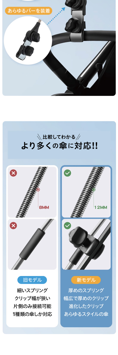 グリップ力のあるクリップ式なので、一般的な長傘から日傘、子ども用傘までしっかりホールドします。持ち手部分が少し太めでも挟みやすく、ズレにくい形状です。