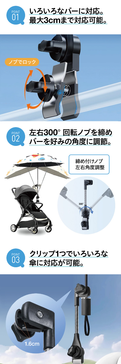 傘を挟む部分は360°傾けられる仕様。人の位置や高さに合わせて細かく角度を変えられるので、雨や日よけ効果を無駄なく発揮します。