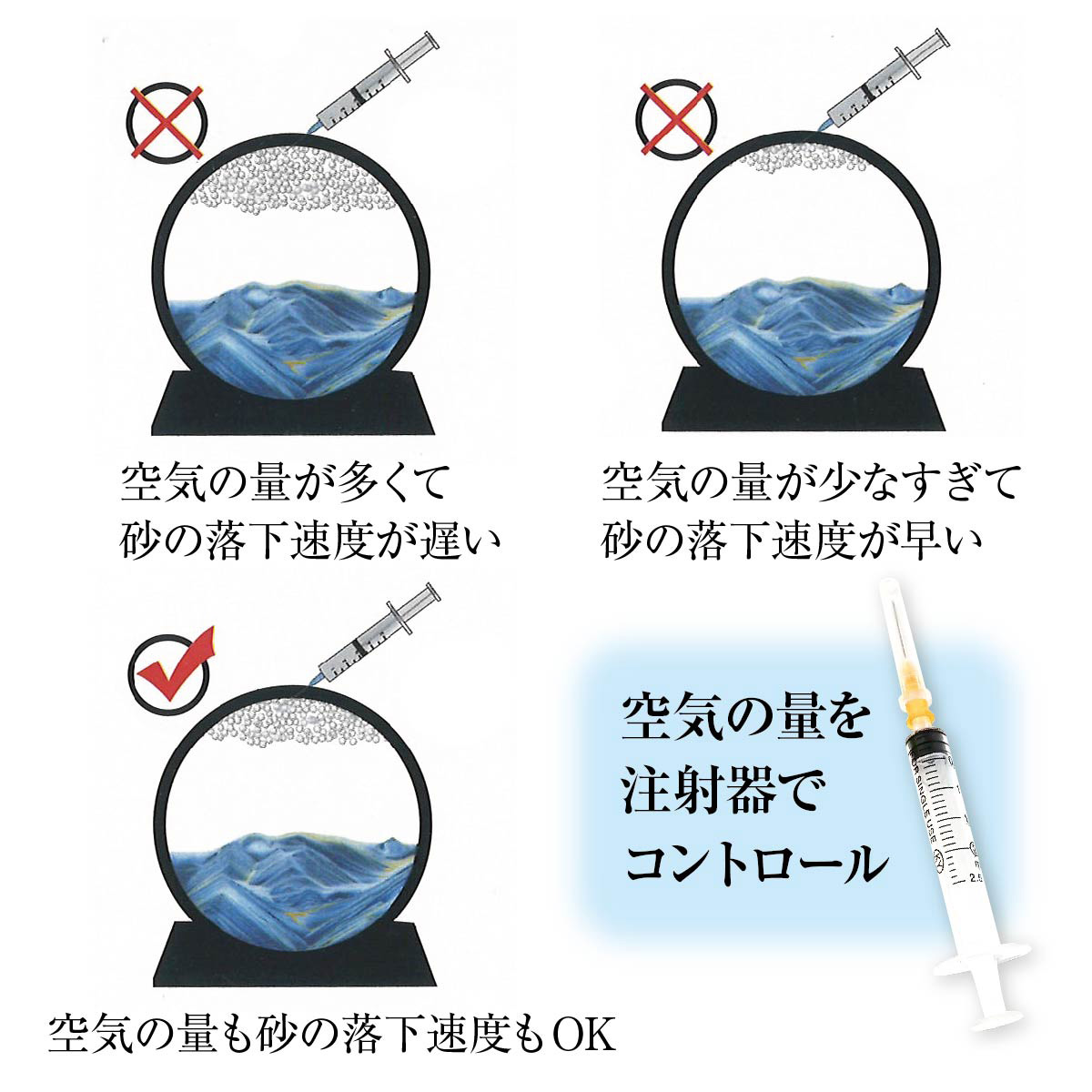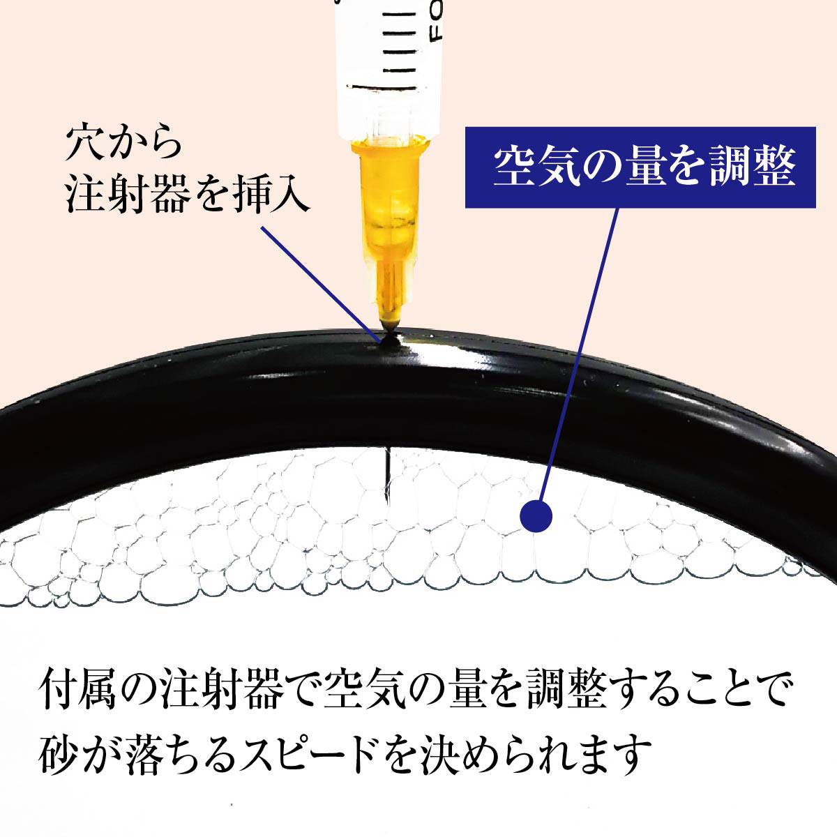 付属の注射器で空気の量を調整することで、砂が落ちるスピードを決められます。