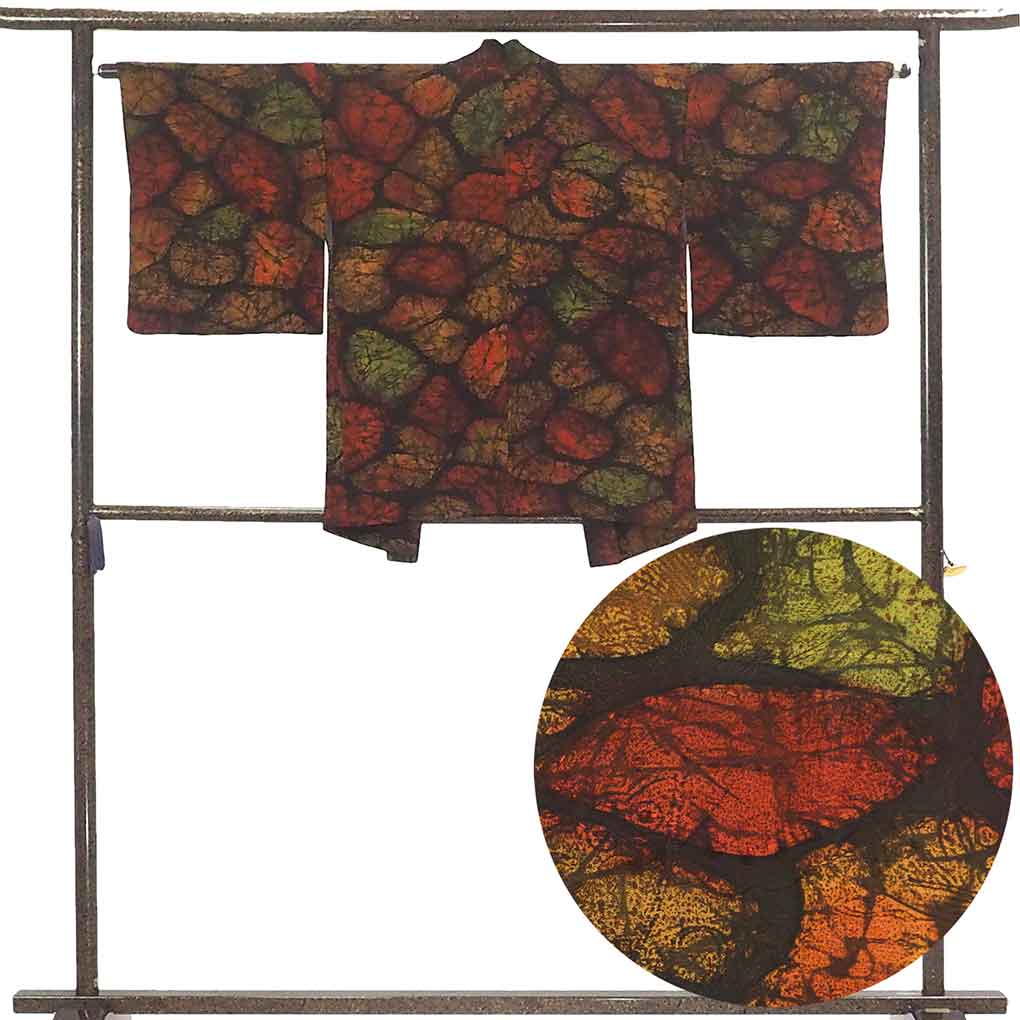 正絹のちりめん地の袷羽織です。黒地に抽象柄で紬や小紋などカジュアル用途の着物に合わせてお使いいただけます。裄の縫い代は4cm程度ありそうです。