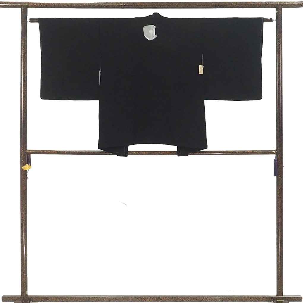 正絹のちりめん地の袷羽織です。黒地に関西風の丸なしの五三の桐一つ紋入で小紋の上に羽織るとフォーマルな装いになる便利なアイテムです。羽織紐はついておりません。裄の縫い代は6cm程度ありそうです。