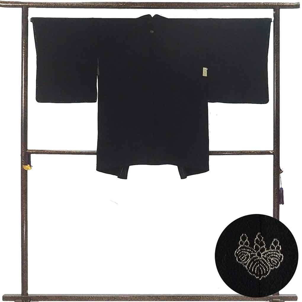 正絹のちりめん地の袷羽織です。黒地の無地に関西風の丸なしの五三の桐けし縫い一つ紋入で小紋の上に羽織るとフォーマルなっ装いになる便利なアイテムです。羽織紐はついておりません。裄の縫い代は2.5cm程度ありそうです。