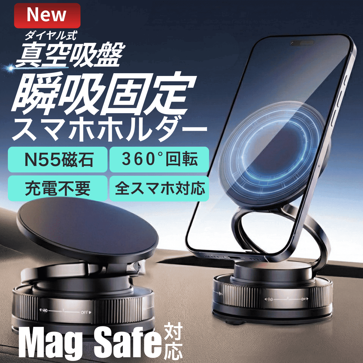 スマホホルダー 車載ホルダー マグネット スタンド 車 真空吸着 N55磁石 吸盤 360°回転 マグセーフ 2WAY 折り畳み式 片手操作 全機種対応 iPhone Android