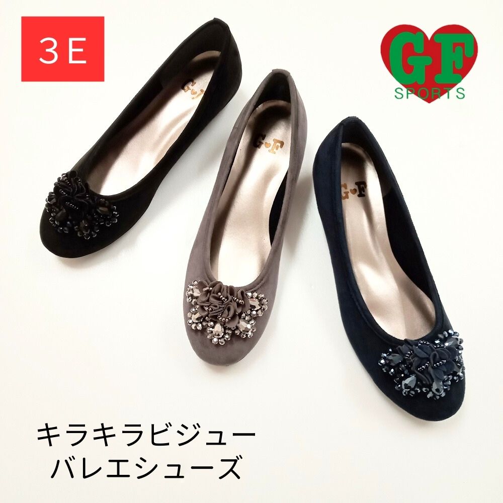バレエシューズ バレーシューズ ぺたんこ 軽量 カジュアルパンプス 幅広 3E ビジュー ゴールデンフット 日本製 合皮 婦人靴 レディースシューズ