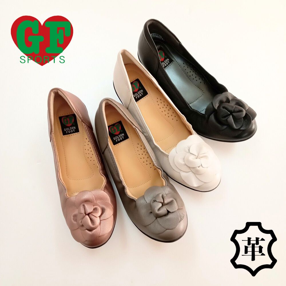 パンプス バレエシューズ バレーシューズ フラットシューズ フラワーコサージュ ゴールデンフット 本革 山羊革 レザー 婦人靴 レディースシューズ