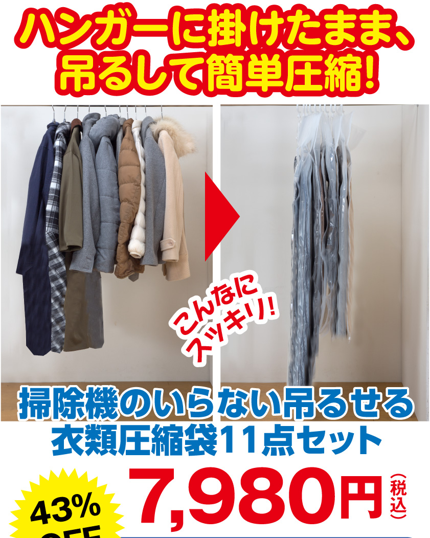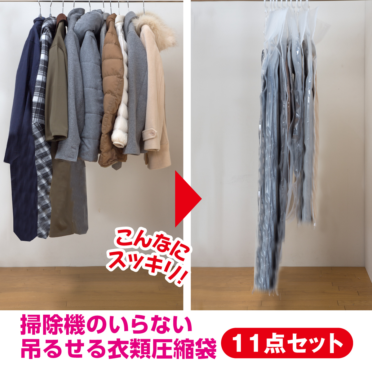 【掃除機のいらない吊るせる衣類圧縮袋11点セット】の特長