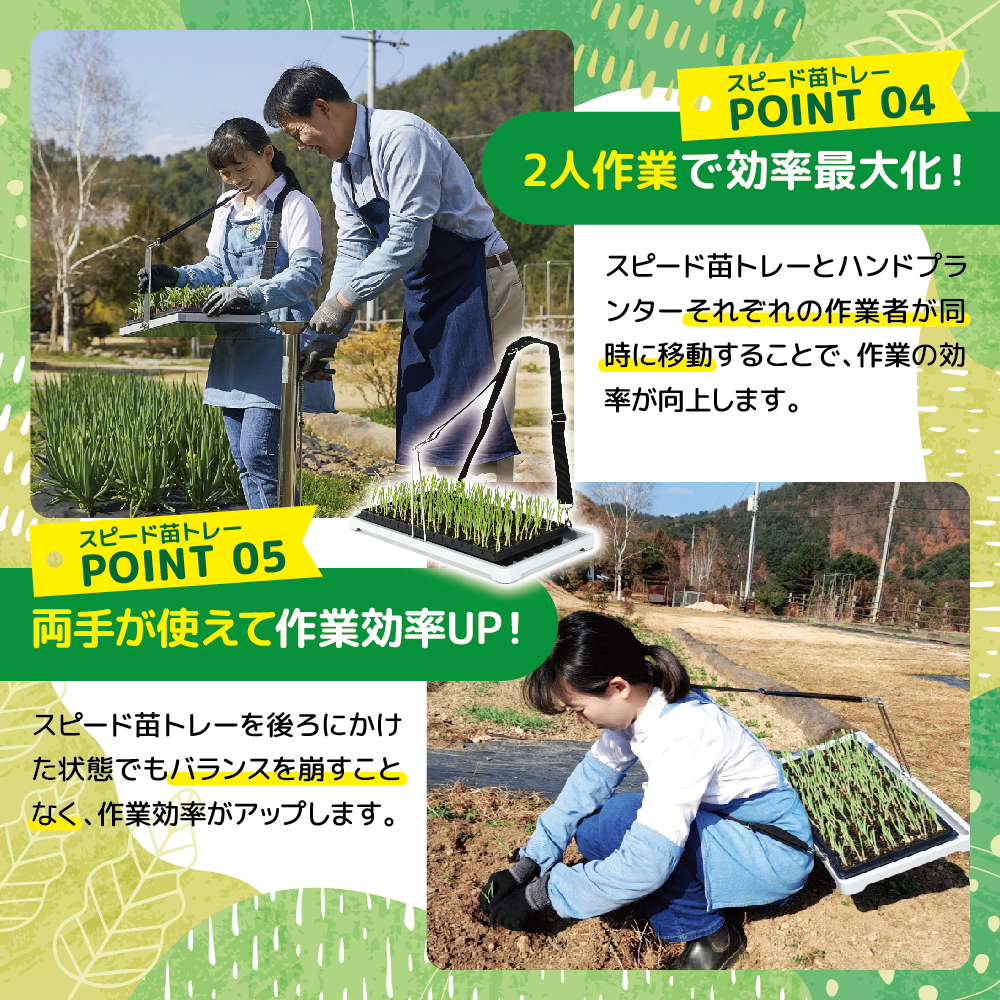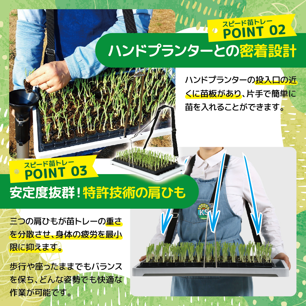 適合苗ポットの規格:市販の苗トレー(一般トレー540×280mm/移植機用育苗ピットトレー590×300mm)