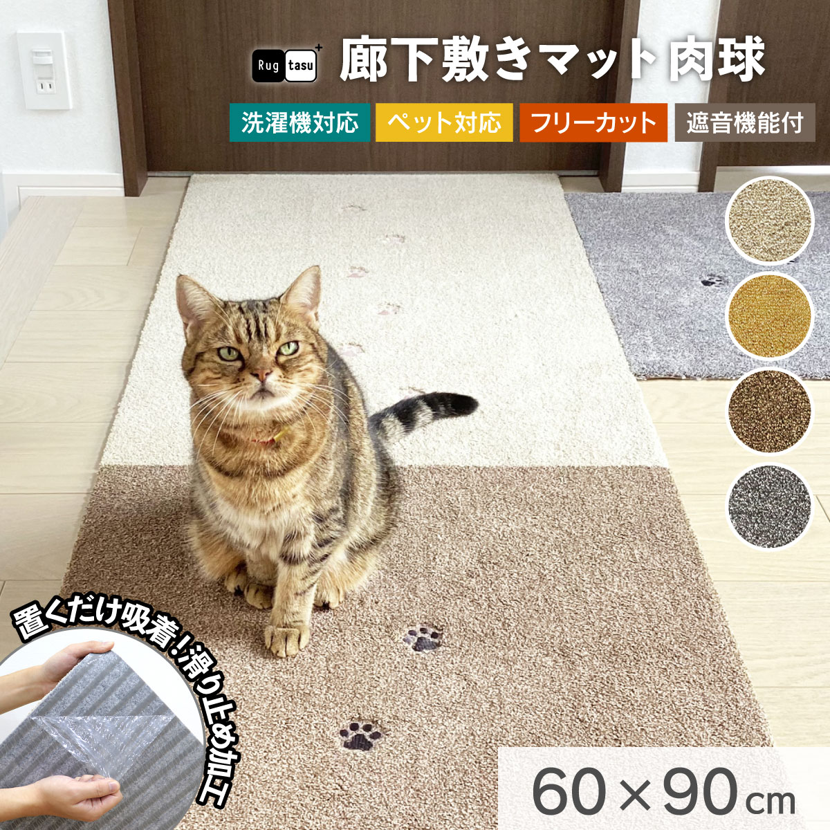 廊下敷きカーペット 肉球 幅60×90cm 玄関 キッチン 階段 マット 洗える 置くだけ吸着 フリーカット 床暖 ペット対応