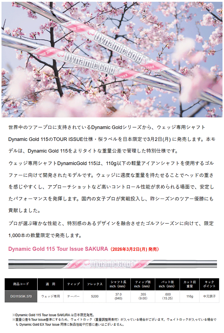 ウェッジ専用シャフトDynamicGold 115は、110g以下の軽量アイアンシャフトを使用するゴルファーに向けて開発されたモデルです。ウェッジに適度な重量を持たせることでヘッドの重さを感じやすくし、アプローチショットなど高いコントロール性能が求められる場面で、安定したパフォーマンスを発揮します。国内の女子プロが実戦投入し、昨シーズンのツアー優勝にも貢献しました。プロが選ぶ確かな性能と、特別感のあるデザインを融合させたゴルフシーズンに向けて、限定1,000本の数量限定で発売します。