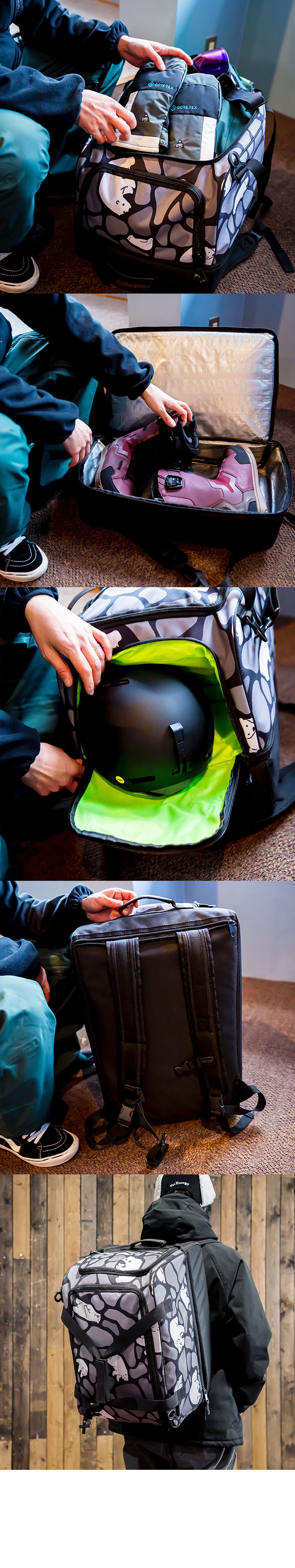・59Lの大容量でブーツ、ウェア、小物を一括収納可能。