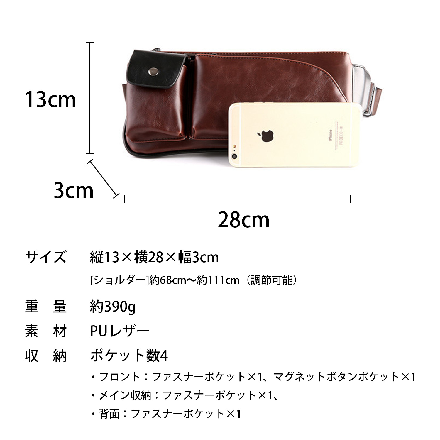 仕様:ポケット数4(フロント:ファスナーポケット×1、マグネットボタンポケット×1、メイン収納:ファスナーポケット×1、背面収納:ファスナーポケット×1)