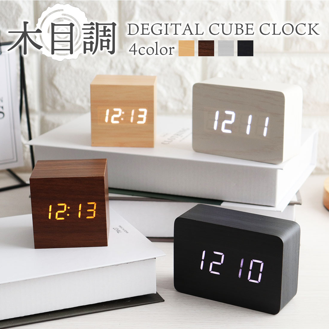木目調のナチュラルなデザインがインテリアに溶け込むおしゃれな置き時計コンパクトで邪魔にならないサイズ感。LEDディスプレイなので視認性も◎3組のアラームをセットすることができるので目覚まし時計としてもお使い頂けます。ディスプレイの表示を切り替えることができ、時間だけではなく日付や温度を表示することができます。音感センサーを内蔵しており、タッチまたは手を叩くなどで自動点灯することができます。自動消灯と常時点灯を切り替えられることができるので、省エネや利便性などお好みに合わせて設定頂けます。正方形と長方形の2パターン、4カラーのラインナップとなっております。