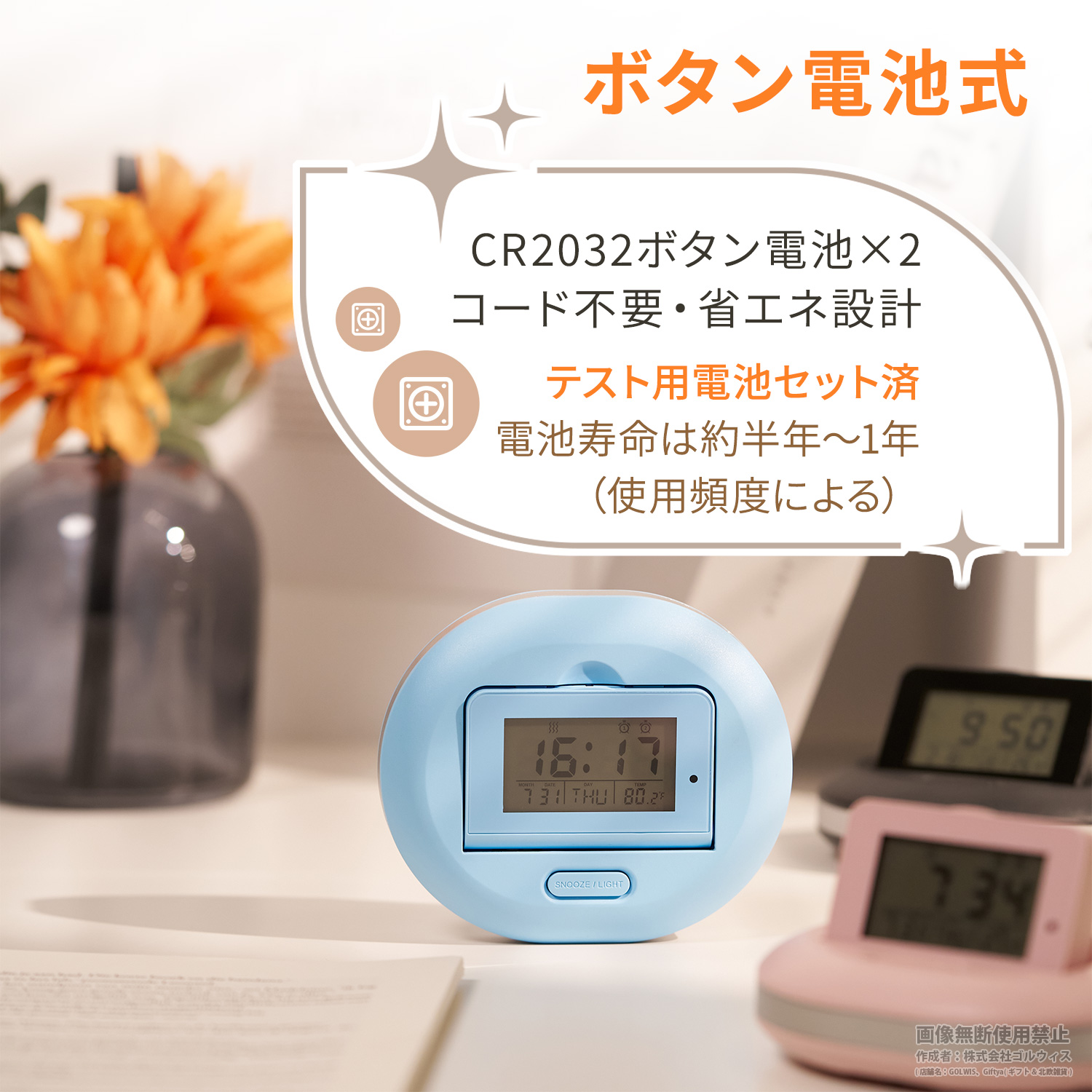 機能:3way(音、振動、ライト)、アラーム2組(ボタンひとつで切り替え)、バックライト、LCDディスプレイ、カレンダー(12/24h表示)、曜日表示、温度表示、アラーム間隔設定、スヌーズ、タイマー