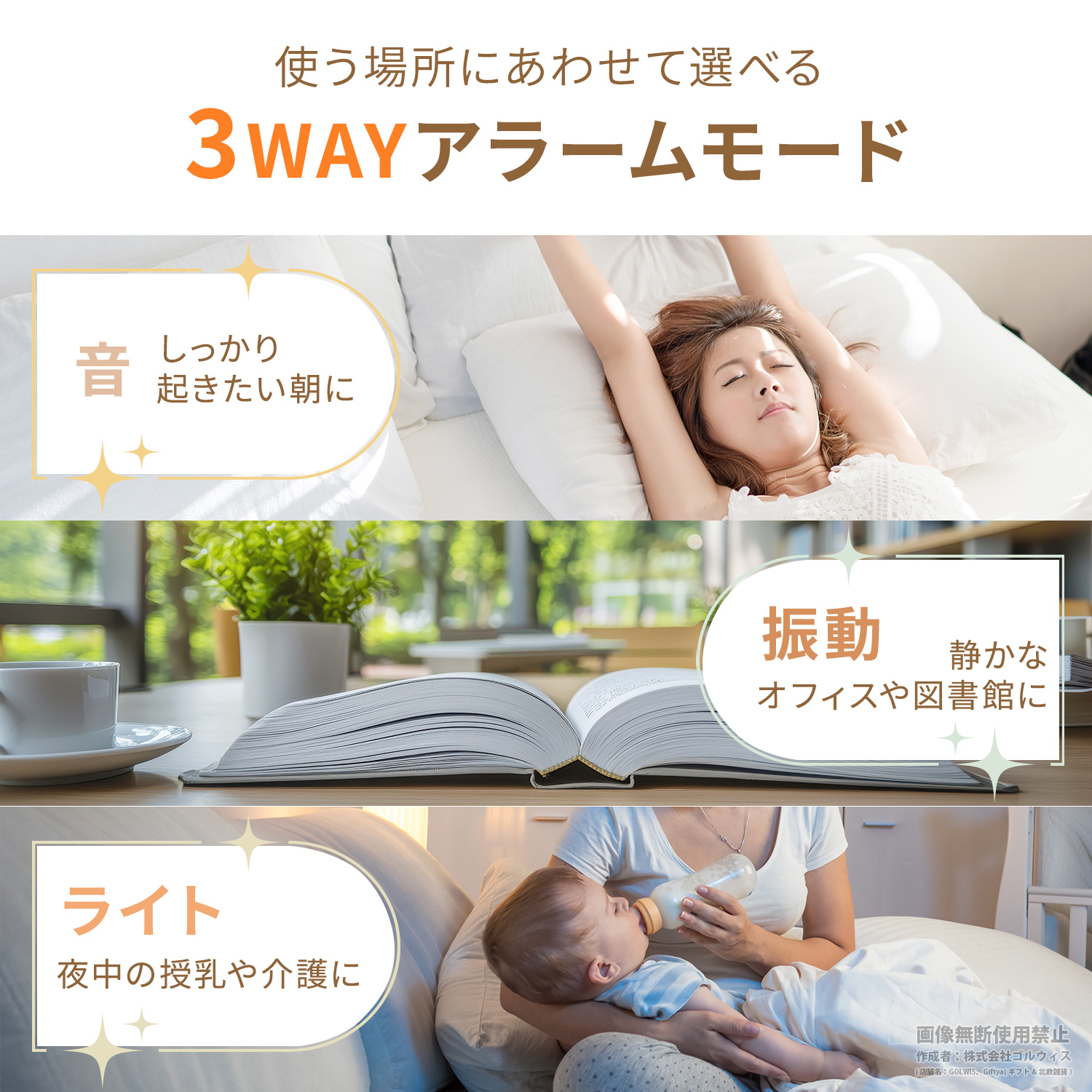 音しっかり起きたい朝に、振動静かなオフィスや図書館に、ライト夜中の授乳や介護に