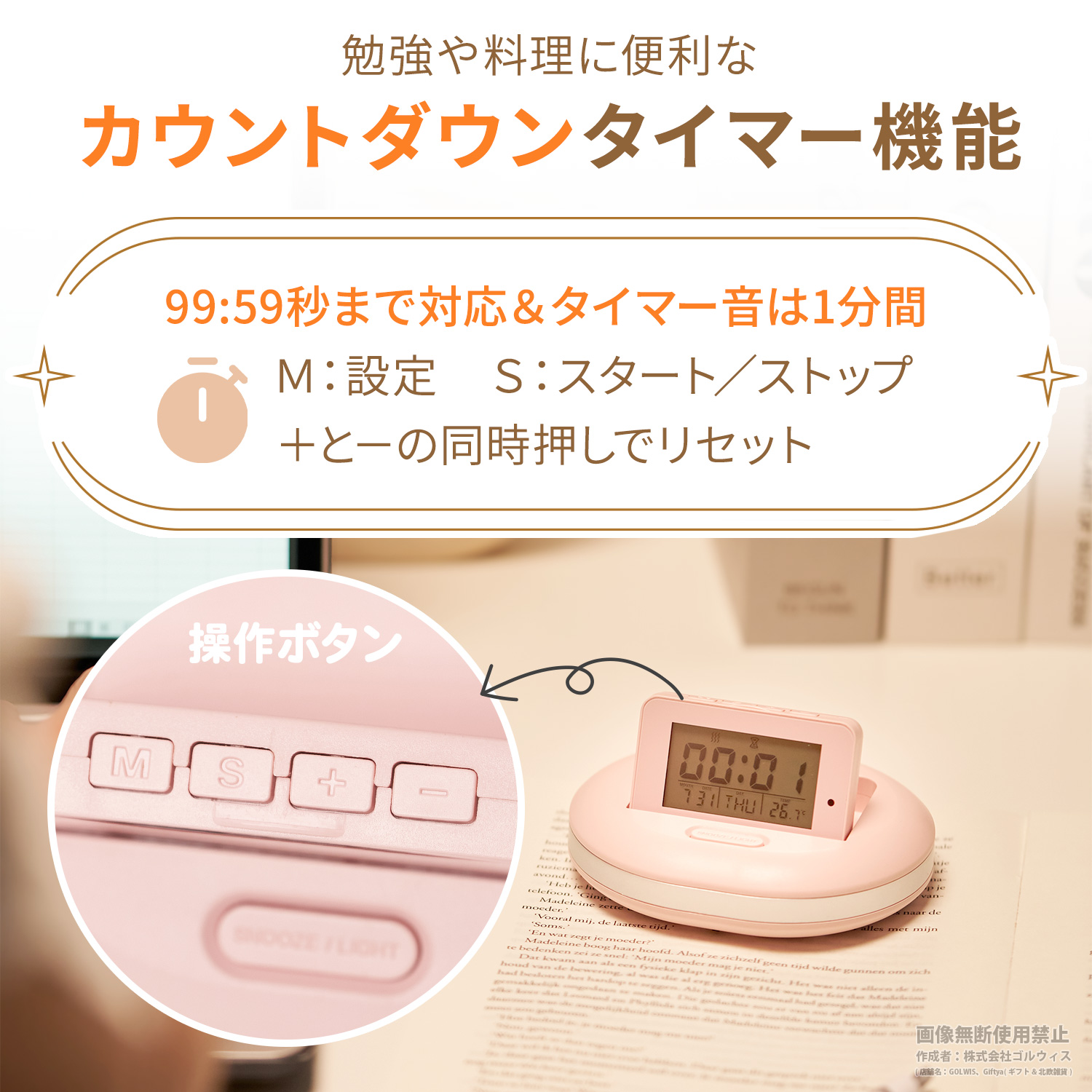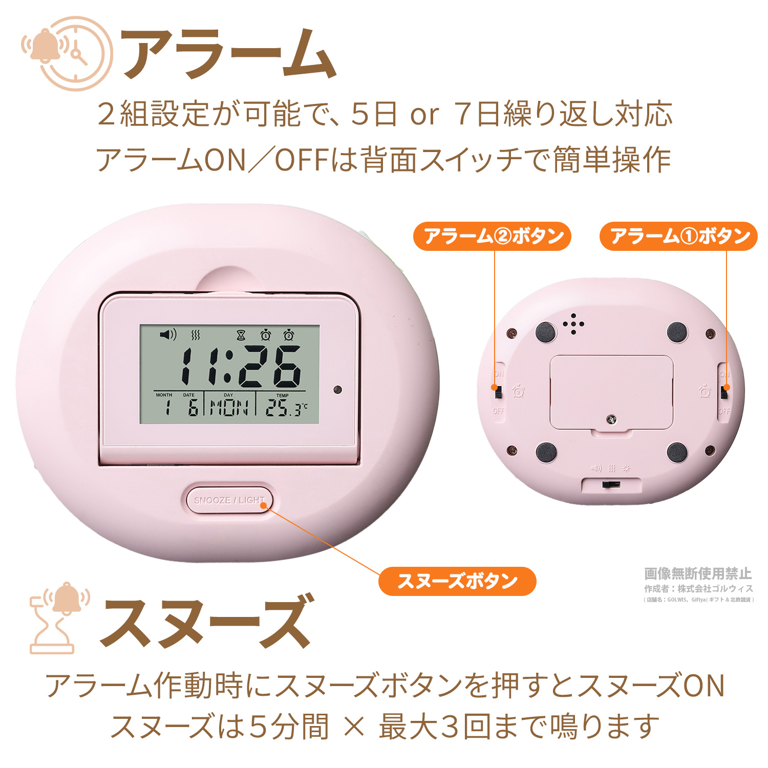音、振動、ライト使う場所を選ばない3WAYアラーム目覚まし時計使う場所にあわせて選べる3WAYアラームモード音しっかり起きたい朝に、振動静かなオフィスや図書館に、ライト夜中の授乳や介護に直感的なボタン配置で簡単操作 アラームのON・OFFもスイッチ1つで切り替え2組のアラーム設定が可能で5日or7日繰り返し対応アラーム作動時にスヌーズボタンを押すとスヌーズON 5分間、最大3回まで鳴りますカウントダウンタイマー機能 タイマー音は1分間鳴り続けます※商品写真はできる限り実物の色に近づけるよう徹底しておりますが、 お使いのモニター設定、お部屋の照明等により実際の商品と色味が異なる場合がございます。 クリスマス プレゼント ギフト 贈り物 誕生日