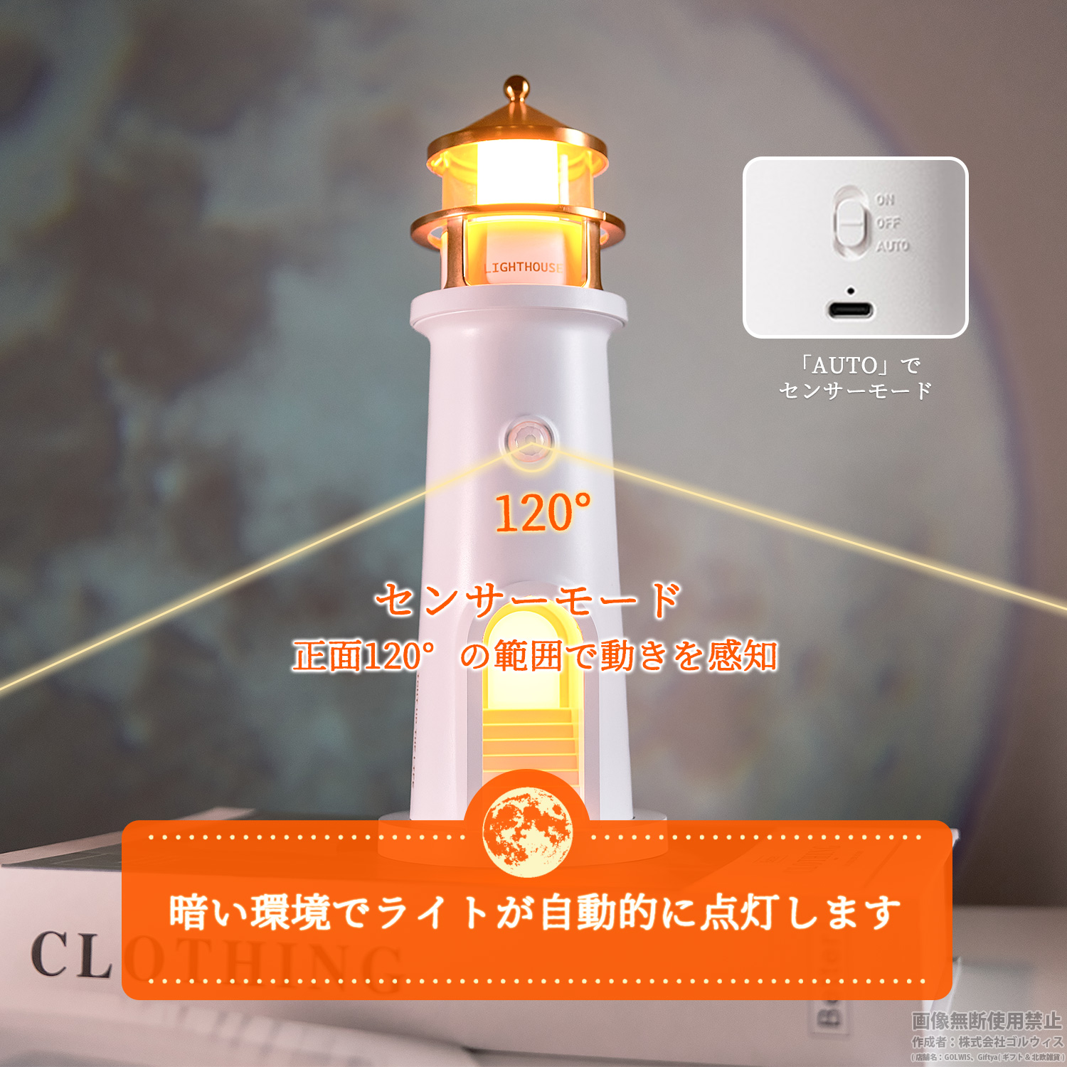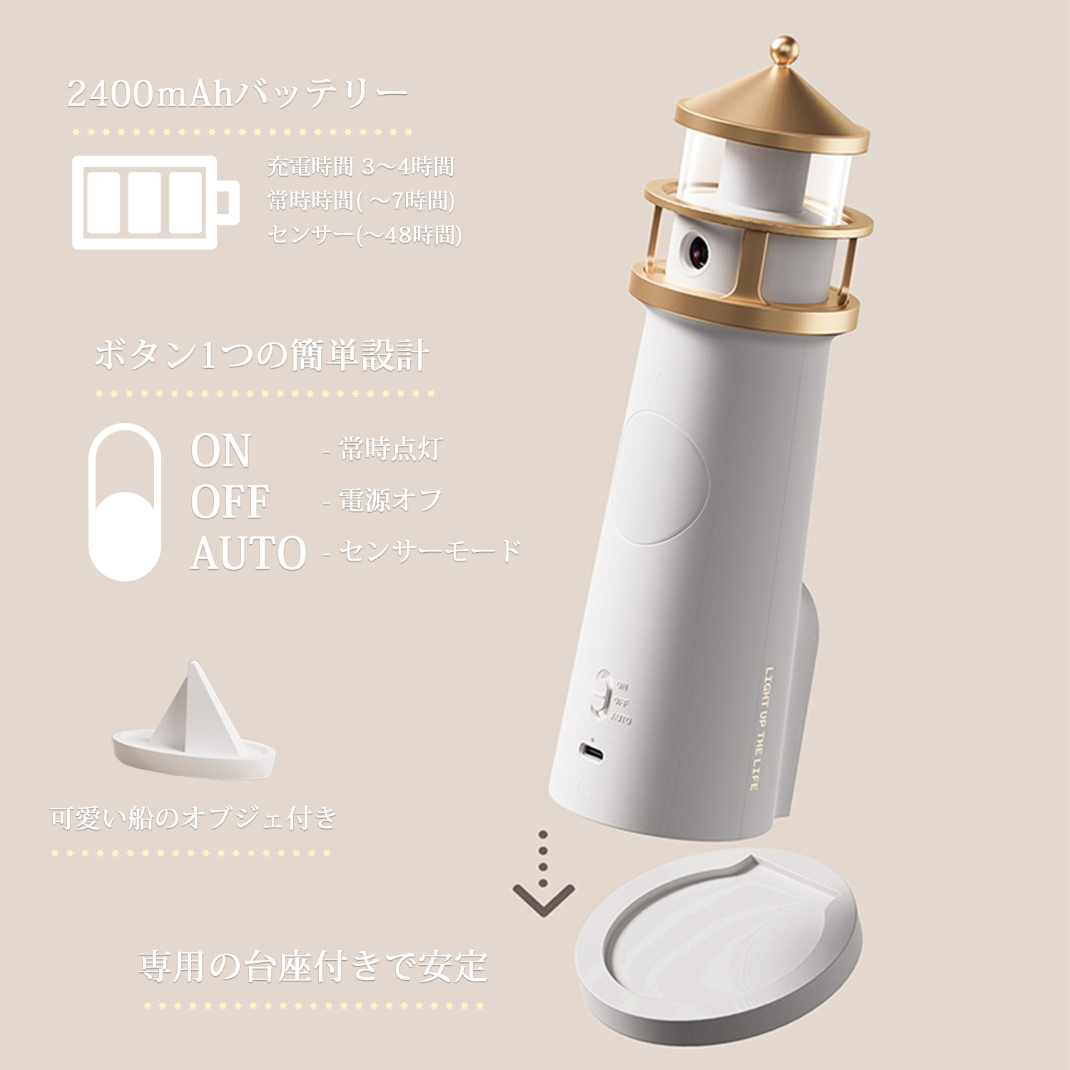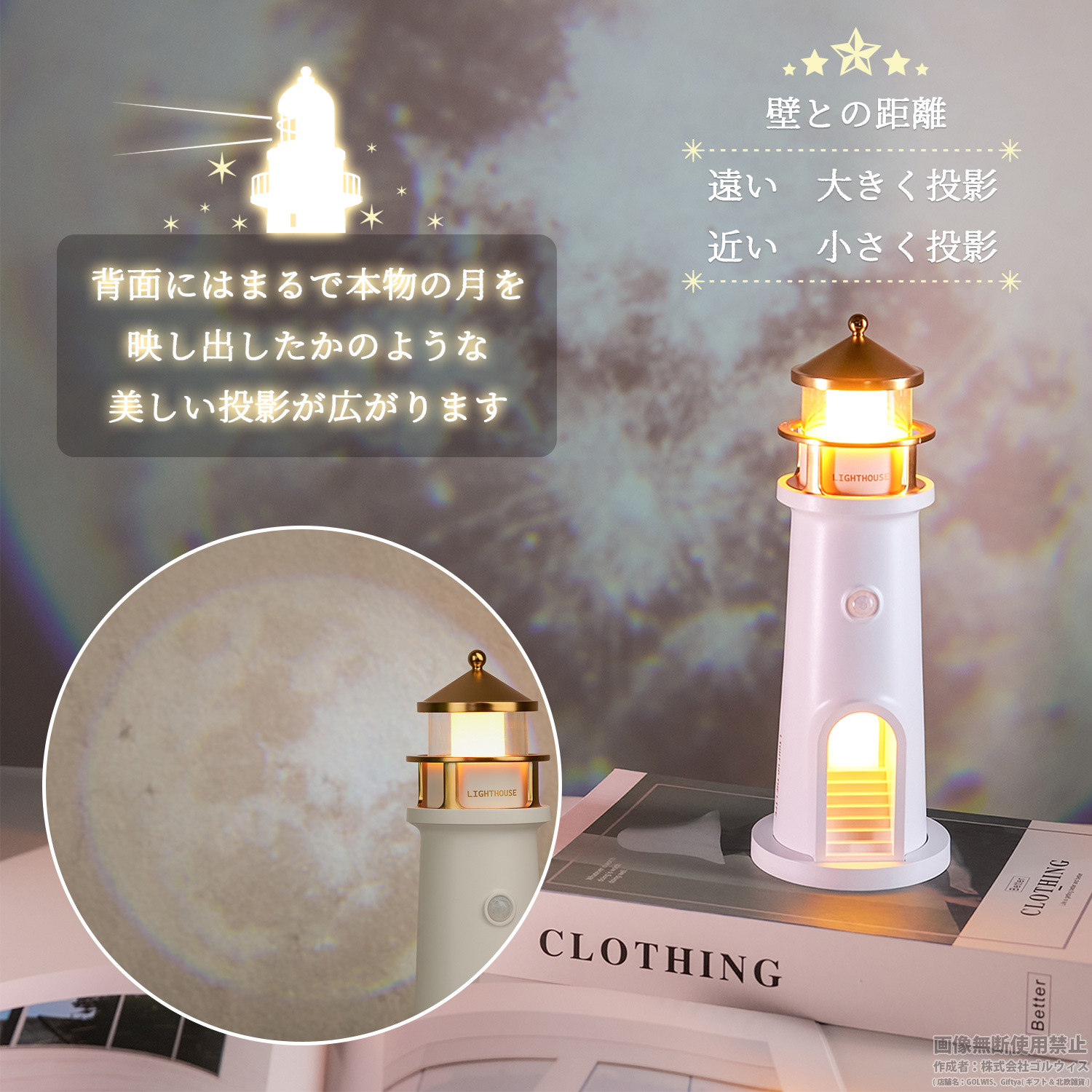 幻想的な灯台の光と月の輝きが広がる癒しのセンサーライトセンサーモードは正面120°の範囲で動きを感知し、暗い環境でライトが自動で点灯します背面にはまるで本物の月を映し出したかのような美しい投影が広がります壁との距離が遠いと大きく投影、近いと小さく投影します2400mAhバッテリー最大48時間の点灯が可能で、充電式なので場所問わず設置頂けますボタン1つの簡単設計 ONにすると常時点灯し間接照明として、AUTOにするとセンサーライトとしてお使い頂けます専用の台座と可愛い船のオブジェが同梱されています※商品写真はできる限り実物の色に近づけるよう徹底しておりますが、 お使いのモニター設定、お部屋の照明等により実際の商品と色味が異なる場合がございます。 爆買 クリスマス プレゼント ギフト 贈り物 誕生日