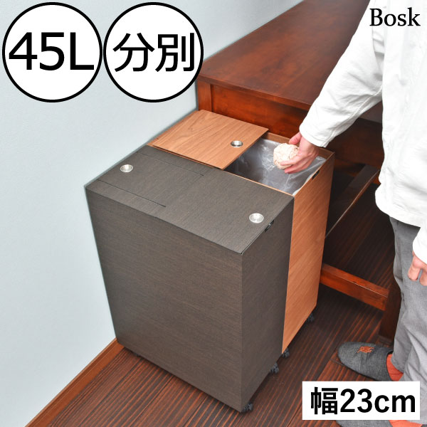 上品な木目調のデザインでインテリアのようにお部屋の雰囲気に馴染むゴミ箱。従来バスクシリーズをブラッシュアップし、細部にまでこだわった美しい質感を実現しました。横幅を2cm広くし、袋留めの台座を変更することで、ゴミ袋をより取り外しやすく改良。断面部が見えていた木目模様の継ぎ目感をなくし、フタ部分の段差を取り除くことでより美しいデザインに。ゴミ箱特有の生活感を排除して、インテリアの一部としておしゃれに置くことができます。幅23cmと省スペースにも関わらず、容量はゴミをたっぷり捨てられる45L。高さのでないスライド式のフタなので、高さ制限がある場所でも簡単に設置可能です。袋をしっかり固定できて、2分別もできる袋留めが付いてくるので、袋が外から見える心配もありません。日本製のしっかりした造りで、お部屋を高級感あふれる雰囲気に演出します。