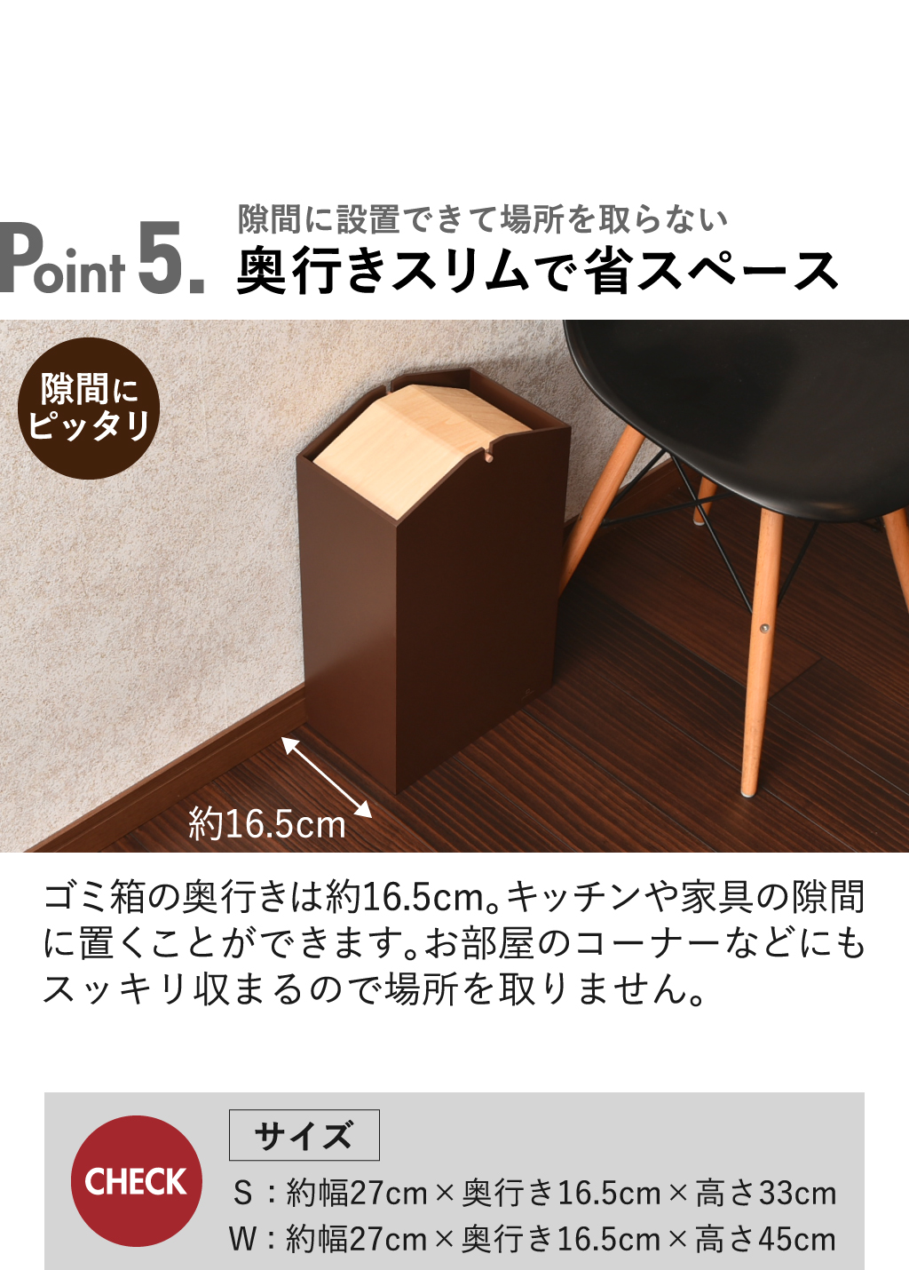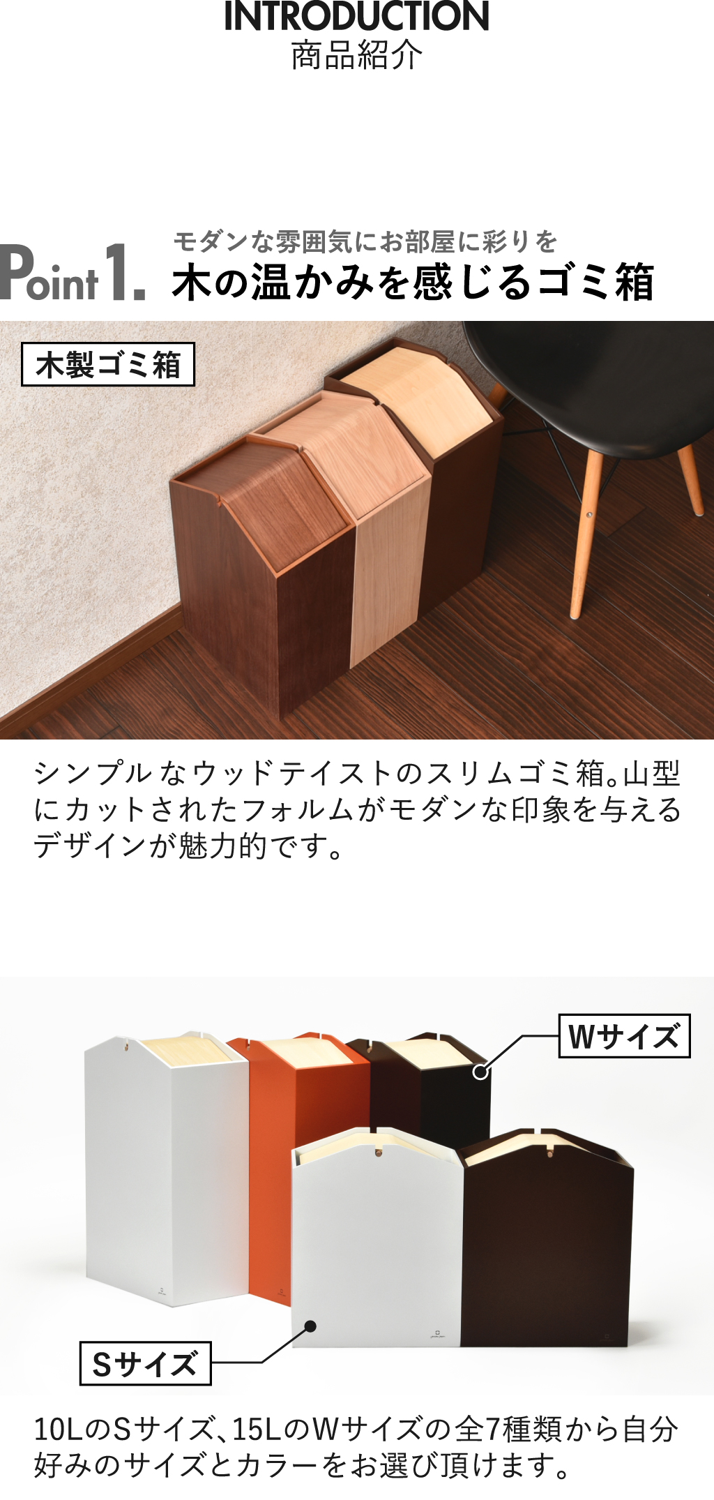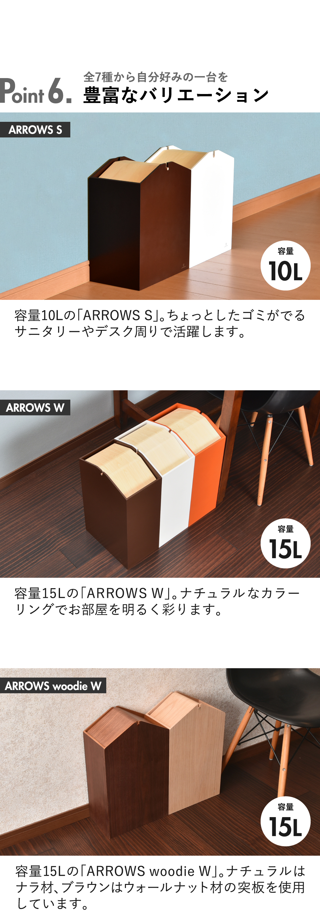 山型にカットされたフォルムがモダンなスイング式ゴミ箱「ARROWS(アローズ)」。木のぬくもりを感じるナチュラルなデザインで、お部屋に彩りを与えます。一見ゴミ箱に見えず、まるでインテリアのようにお部屋に溶け込むゴミ箱。スリムなゴミ箱なので、ソファやテレビサイド、玄関の隙間などに置いても場所を取りません。フタは本体の溝に置くだけのシンプルなスイング構造。軽くゴミを押し入れるだけなので余計な力が要らず片手で楽にゴミ捨てができます。ゴミ箱からゴミ袋がはみ出ず、生活感を隠してくれるのも嬉しいポイント。職人がひとつひとつ手作業で仕上げた安心の日本製。古くから伝わる美の伝統を現代の暮らしにマッチさせた高品質ゴミ箱です。