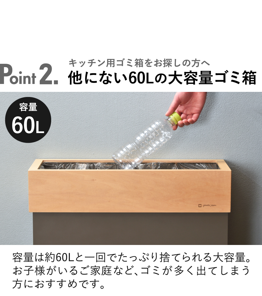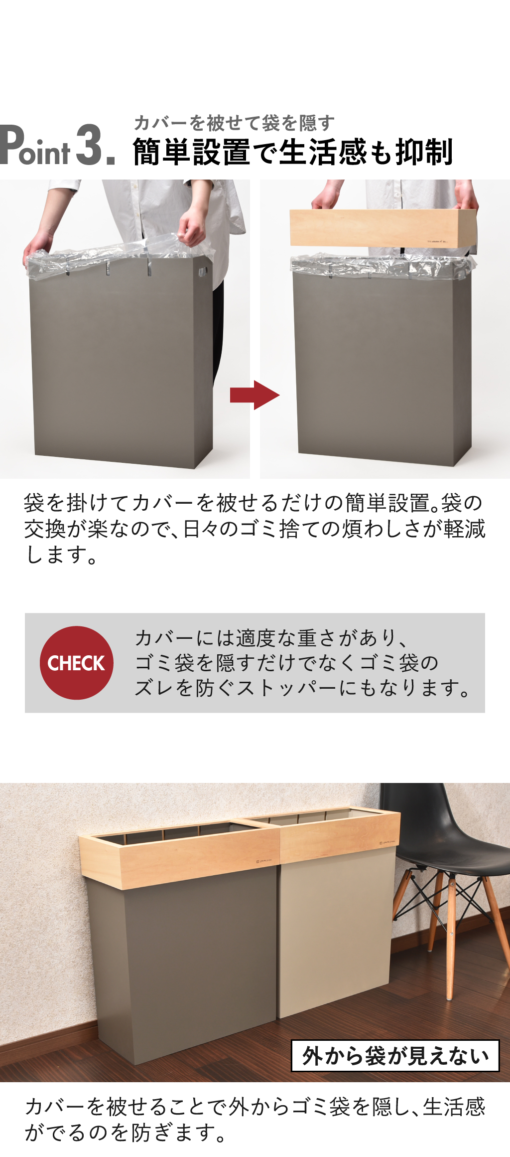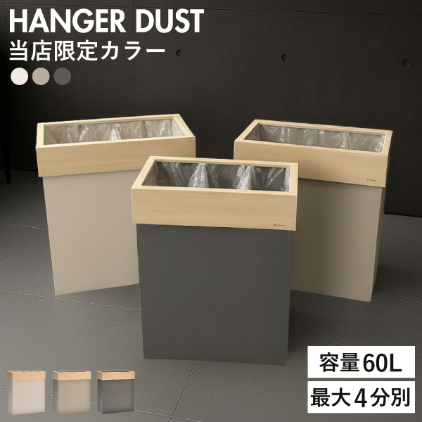 高級感漂うシンプルさとナチュラルな木の温かみを感じられるゴミ箱「HANGER DUST W」。木製家具や北欧インテリアなど様々なテイストとマッチし、シーンを選ばず使えます。カバーを被せるだけで袋を隠せて、ゴミ箱特有の生活感を消します。容量は一回でたっぷり捨てられる約60L。大容量かつ木製ゴミ箱で、他にはない特別なキッチン用ゴミ箱としてもオススメです。本体の溝にゴミ箱をかけるだけで簡単に分別可能。最大4分別できて可燃ごみや缶、ビン、ペットボトルなどこれ一台で全て分別できます。フタが無いため、ゴミ箱の捨て口が広くゴミ捨てもサッと簡単に。職人がひとつひとつ丁寧に仕上げた安心の日本製です。当店限定カラー3色で日々のゴミ捨てを快適にしてくれます。