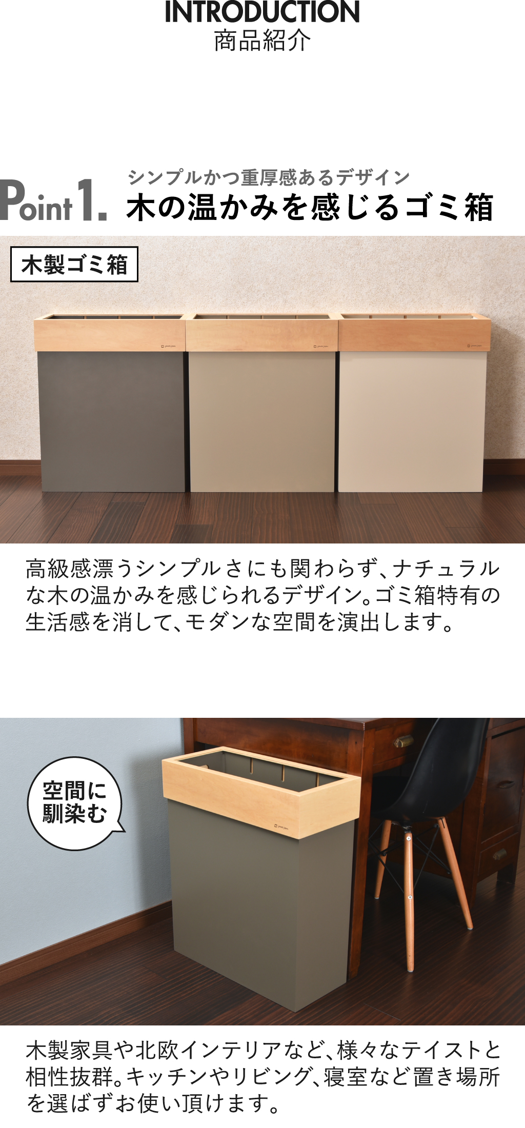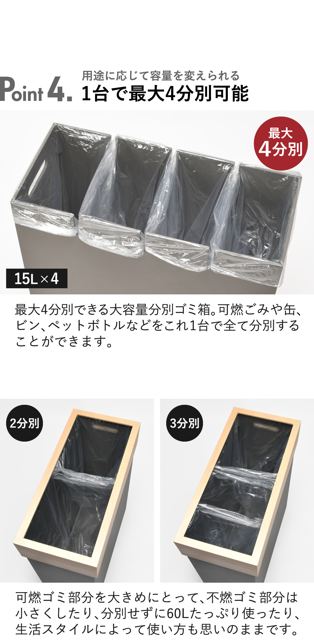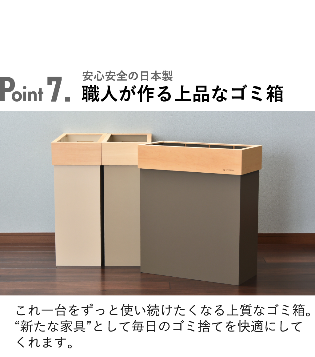 高級感漂うシンプルさとナチュラルな木の温かみを感じられるゴミ箱「HANGER DUST W」。木製家具や北欧インテリアなど様々なテイストとマッチし、シーンを選ばず使えます。カバーを被せるだけで袋を隠せて、ゴミ箱特有の生活感を消します。容量は一回でたっぷり捨てられる約60L。大容量かつ木製ゴミ箱で、他にはない特別なキッチン用ゴミ箱としてもオススメです。本体の溝にゴミ箱をかけるだけで簡単に分別可能。最大4分別できて可燃ごみや缶、ビン、ペットボトルなどこれ一台で全て分別できます。フタが無いため、ゴミ箱の捨て口が広くゴミ捨てもサッと簡単に。職人がひとつひとつ丁寧に仕上げた安心の日本製です。当店限定カラー3色で日々のゴミ捨てを快適にしてくれます。