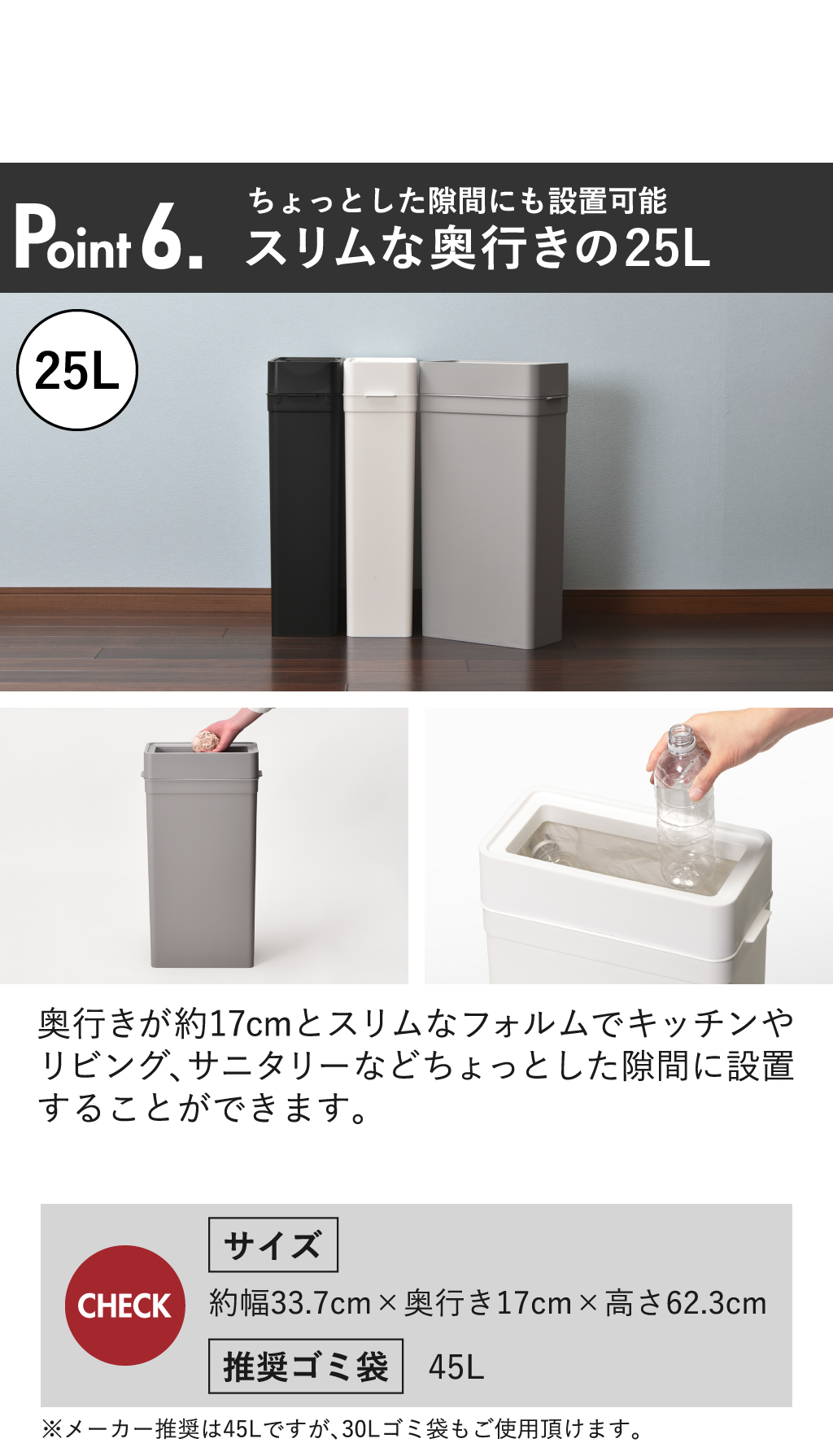 使いやすさと美しさを兼ね備えたフタなしゴミ箱「マルチパーパスビン」。スマートなフォルムと、モノトーンカラーがインテリアに溶け込みます。洗練されたシンプルさにも関わらず、マットな質感で温かみも感じられるゴミ箱。袋を外から隠せるので、生活感が出る心配もありません。コンパクトサイズの「9.5L」はシンク上などのちょっとしたゴミ箱に最適。奥行きスリムな「25L」はキッチンの隙間などに設置することができます。「45L」は一台で2分別でき、たっぷりゴミ捨てできます。袋止めのクリップホールに袋を差し込むだけでしっかり袋を固定。掃除の際も取っ手・くぼみが付いているため簡単に移動可能です。ホワイト・グレー・ブラックから自分好みの一台をお選び下さい。