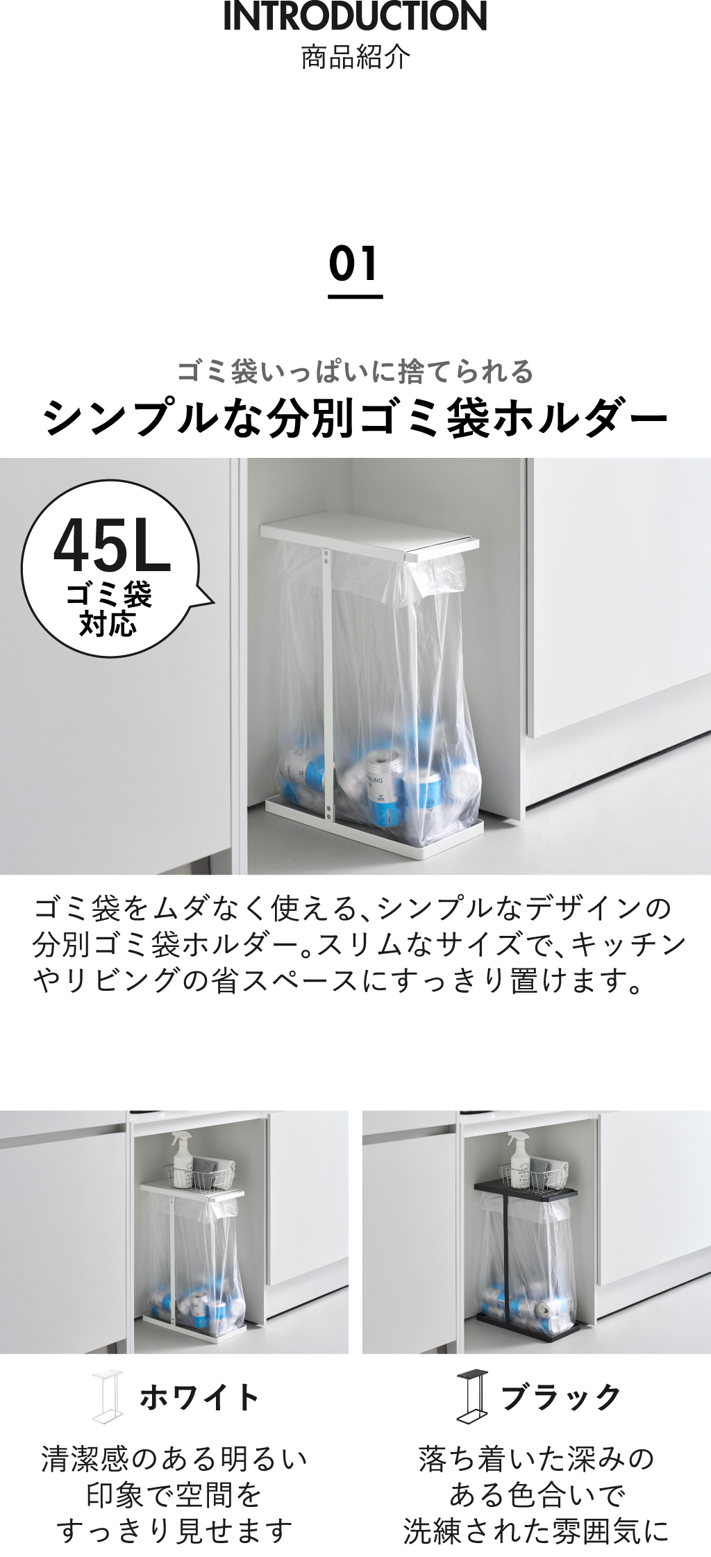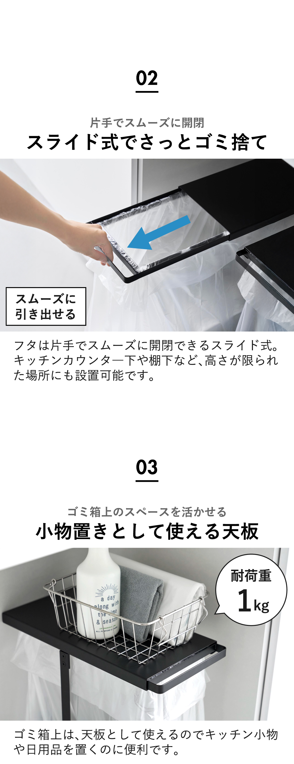 ゴミ袋をムダなく使える、シンプルなデザインの分別ゴミ袋ホルダー45L。ゴミ箱はスリムなサイズで、キッチンやリビングの省スペースにすっきり置けます。45リットルのゴミ袋に対応しているのでたっぷり捨てられます。フタは片手でスムーズに開閉できるスライド式。キッチンカウンター下や棚下など、高さが限られた場所にも設置可能です。ゴミ箱上のスペースを有効活用できる天板付き。キッチン小物や日用品を置くのに便利です。ゴミ袋の取り付け方法は、ゴミ袋を袋ホルダーに被せ、フレーム本体の下から通して溝にはめ込むだけで設置できます。ゴミが溜まったら、袋を下から引き抜くだけで簡単に交換できます。持ち手付きゴミ袋は、フレームのフックに掛けて上から袋止めを載せるだけで設置できます。1台で2分別・3分別も可能です。圧迫感なくすっきり置ける分別ゴミ袋ホルダー45リットル。複数台並べれば、ペットボトルや空き缶、資源ゴミなどを見やすく分別できます。飽きのこないシンプルな構造の分別ゴミ袋ホルダー45L。こちらのアイテムは組立式なので、付属の六角レンチで組み立ててからご使用ください。丈夫で安定感のあるスチール製。汚れてもさっと拭き取れるのでお手入れも簡単です。